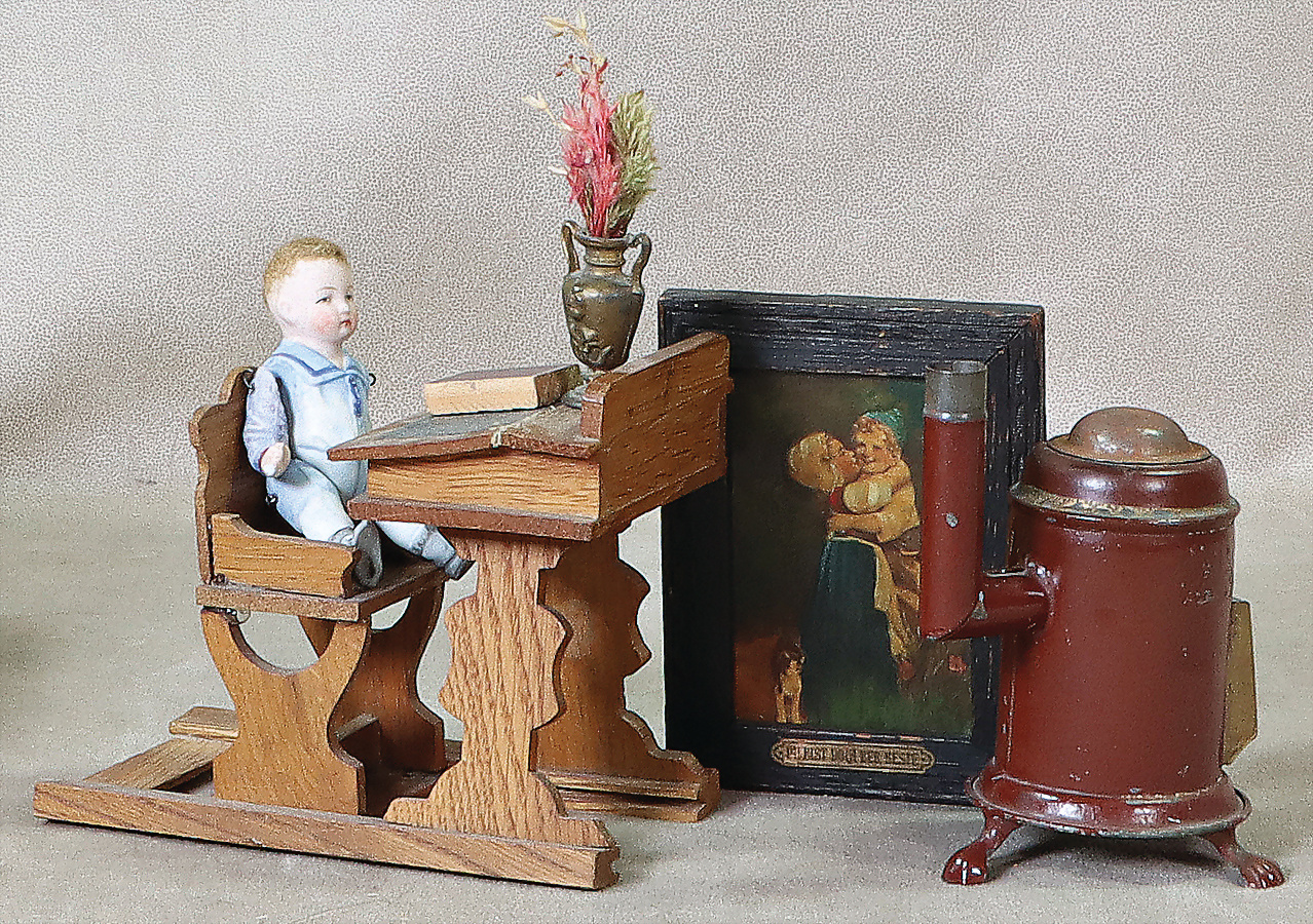 Konv. Puppenstuben-Ausschmückungsteile, Schulbank, H: 11,5 cm, kl. Ofen, Bild, Kleinteile