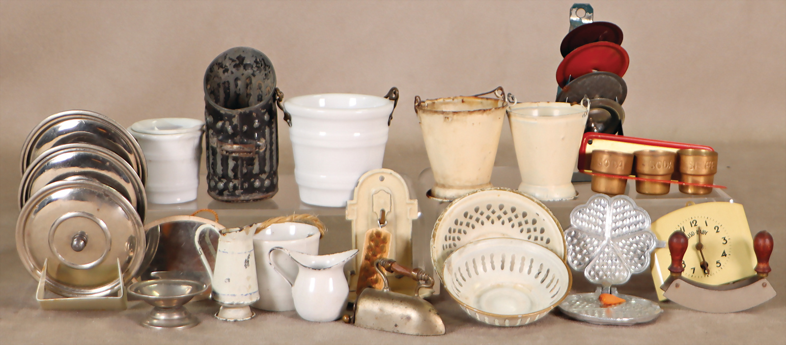 Puppenstuben-Ausschmückungsteile, Waffeleisen, Aluminium, Topfdeckel mit Halter, Schüsseln, Eimer, kl. Uhr, Kleinteile