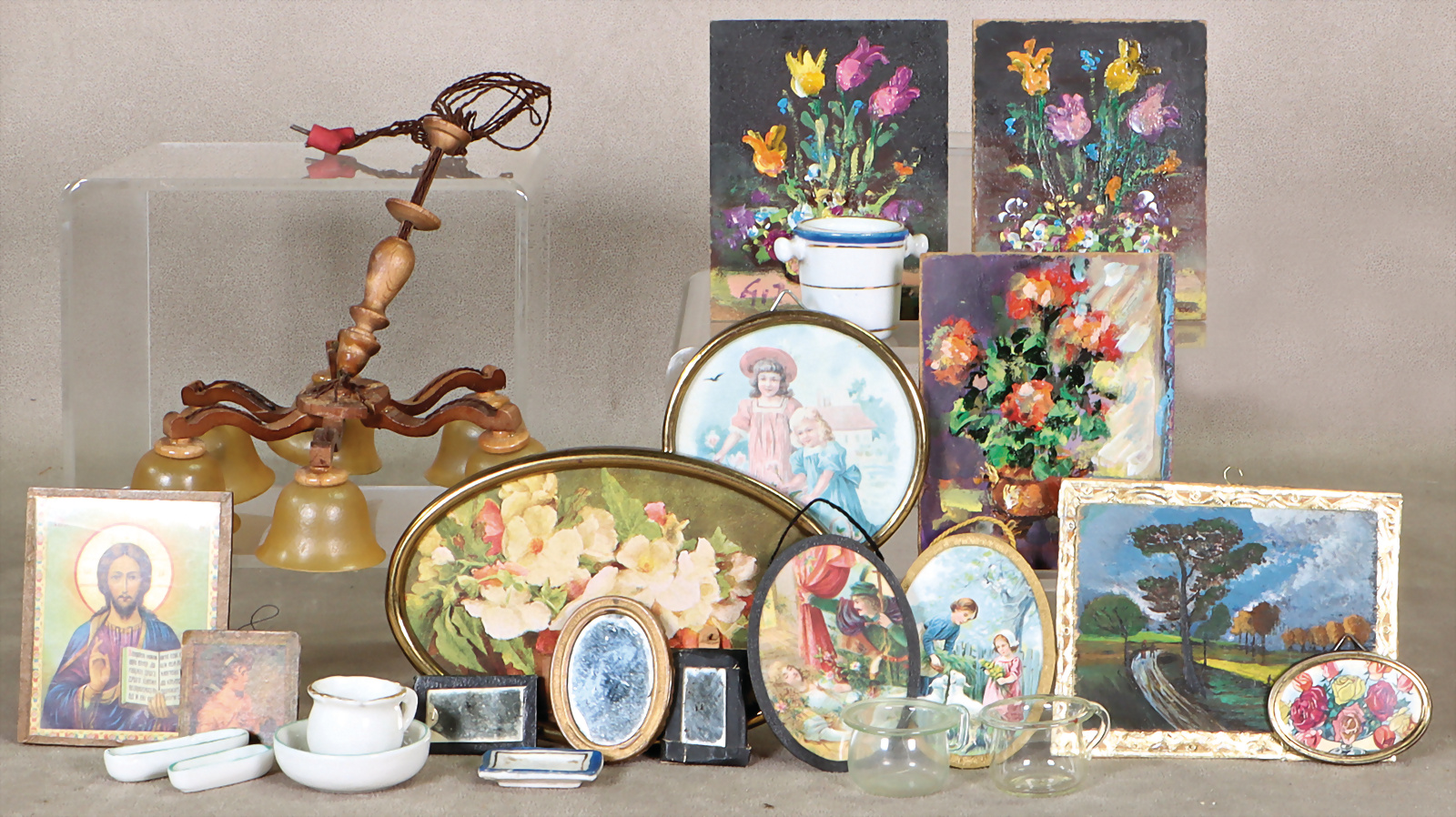 6-armiger Puppenstuben-Deckenleuchter, Holz, Celluloid-Schirme, D: 14 cm, 1x gebrochen, einige Puppenstuben-Bilder, Waschzeug, Porzellan