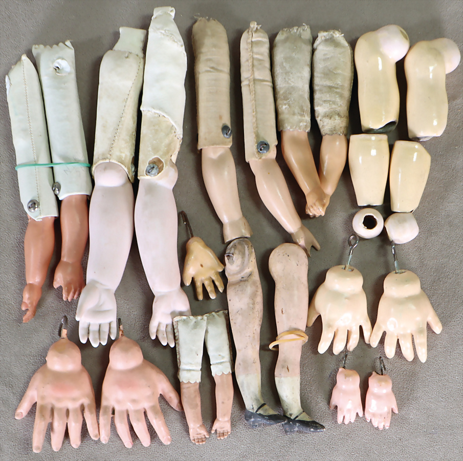 Konv. Puppenhände, Masse, 3 Porzellan-Arme, Wachstuch- u. Lederarme, mit Celluloid-Oberarm, untersch. Gr., meist guter Zust.