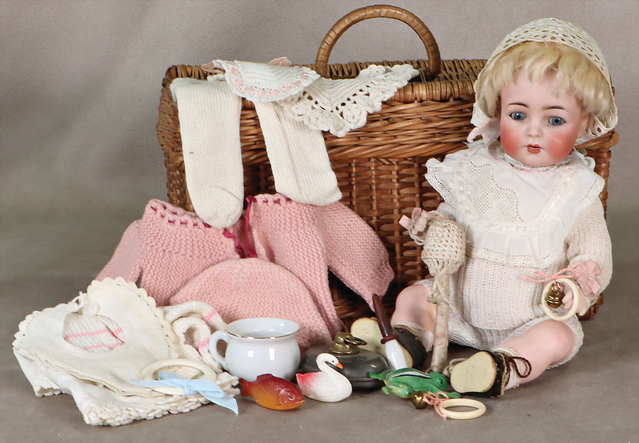 126, 25 cm, Kurbelkopf, blaue Schlafaugen, off. Mund, oben Zähne, Sitbaby-Körper, Mohair-Perücke, einige Kleidungsstücke, Zubehör, im Korb, 1 Halteschnalle fehlt