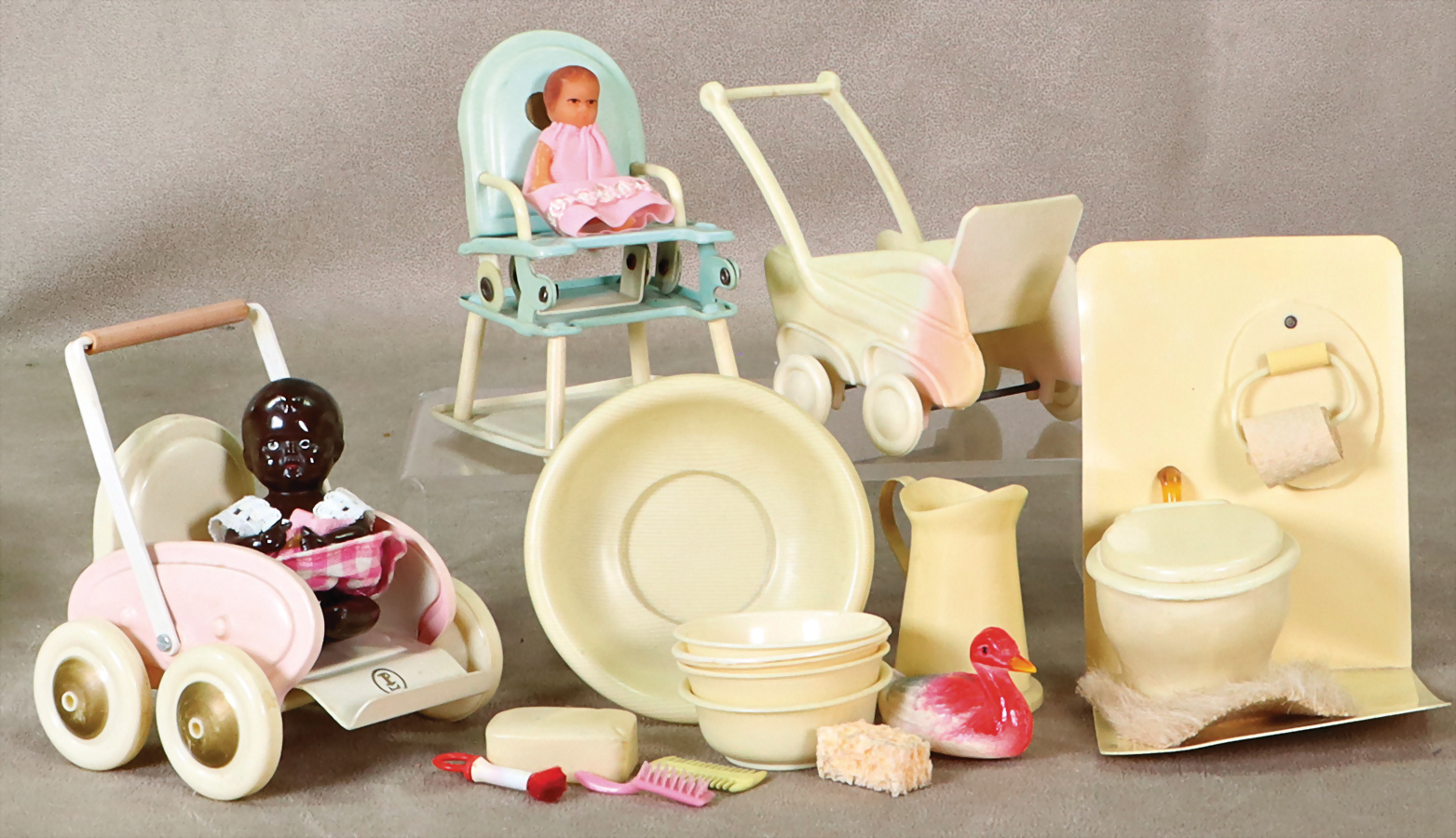 Konv. Celluloid, Kinderwagen, Hochstuhl, Toilette, Waschzeug, Einsatz am Hochstuhl fehlt, 1 Kinderwagen Kunststoff