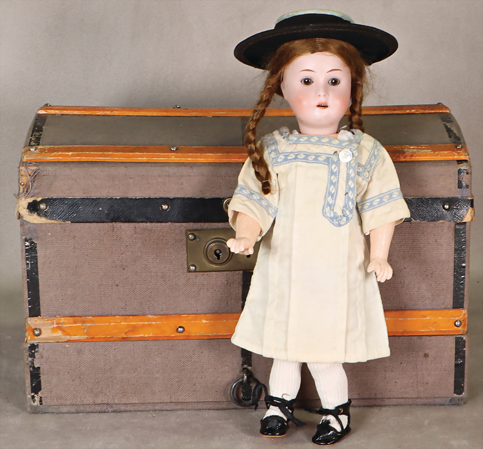 Porzellankopf-Puppe, gem. 1909 DEP RH, 27 cm, Porzellan-Kurbelkopf, braune fest einges. Glasaugen, off. Mund, oben Zähne, Gliederkörper mit Trousseau-Koffer u. einigen Kleidungsstücken