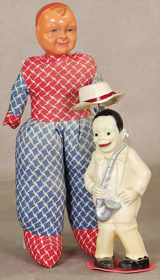 Jazz-Dancer, Celluloid, 15 cm, Uhrwerk intakt, Gesicht wohl ausgebessert, 1 Werfpuppe, SCHILDKRÖT, Einbindekopf, 23 cm