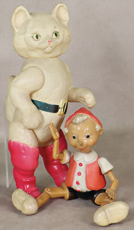 2 Teile, Celluloid, gestiefelter Kater, 28 cm, Gummis lose, 1 Pinocchio, 22 cm