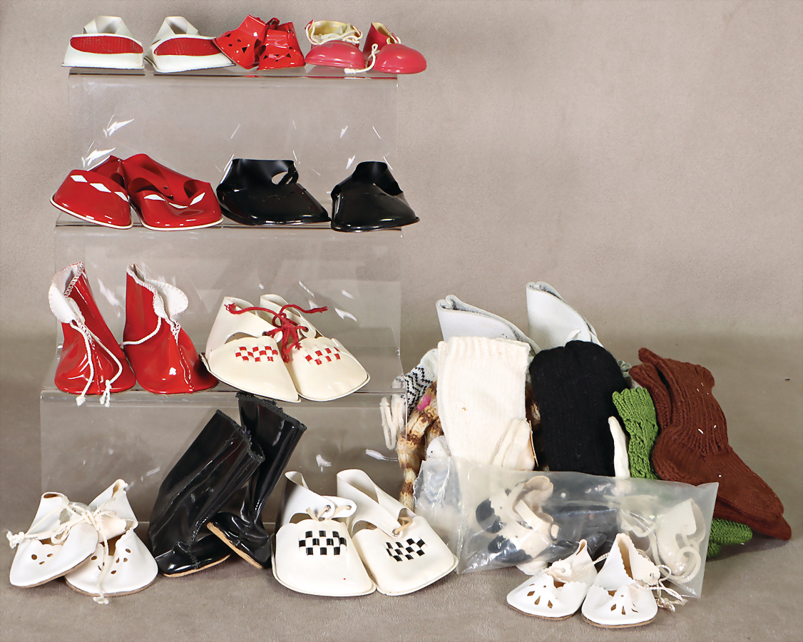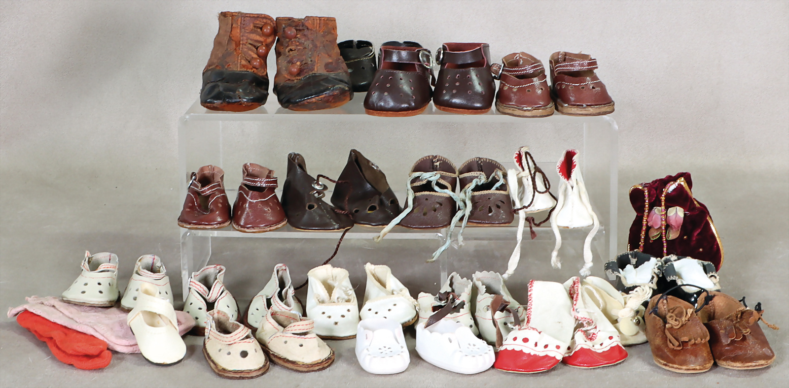 Konv. 15 Paar Puppenschuhe, untersch. Gr., untersch. Zeit u. Materialien, einige Strümpfe, einige Puppenschuhe, SCHILDRÖT Celluloid, Gr. 25 u. 45