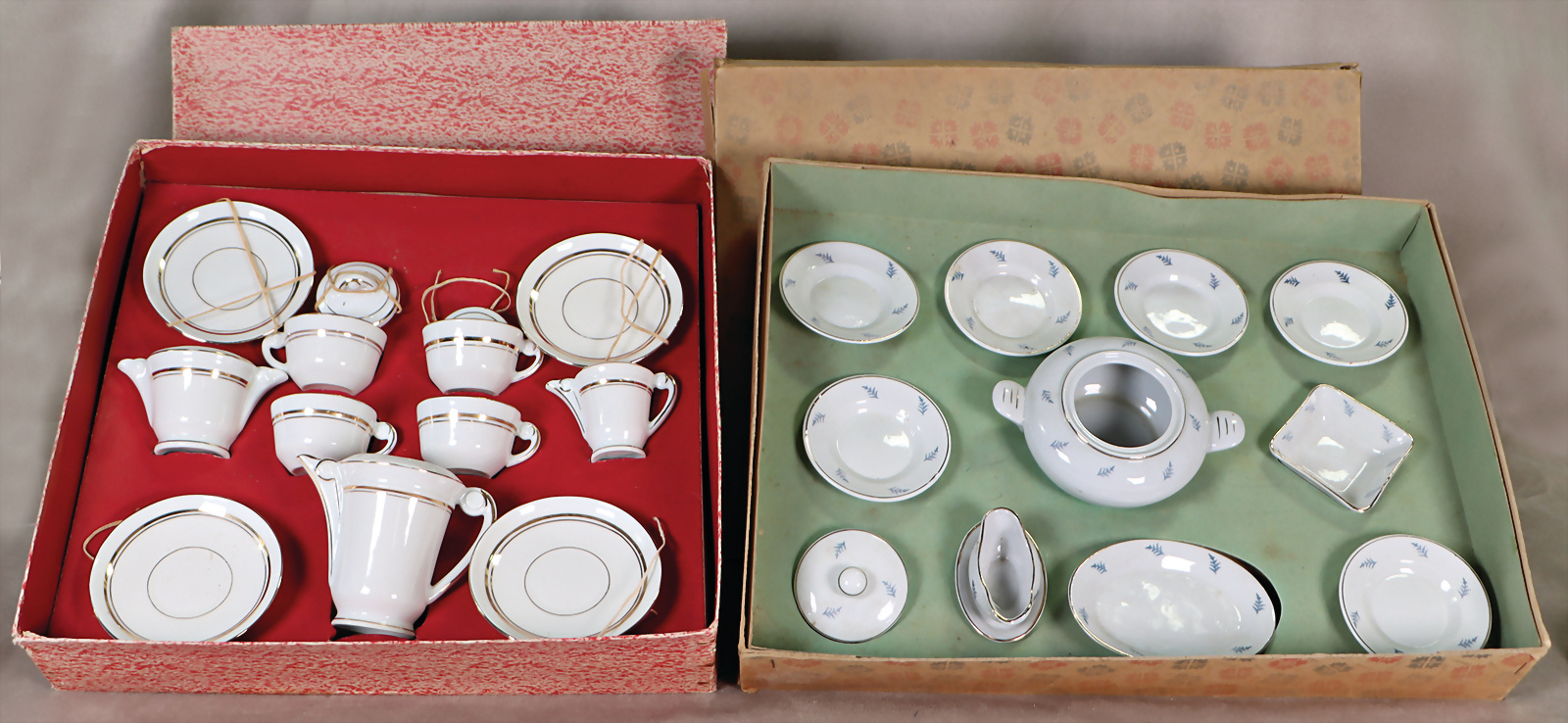 Kinder-Speise-Service, 6 Teller, D: 8 cm, Suppenschüssel, Sauciere, Schalen, im Orig.-Kart., Kaffee-Service, Porzellan, Frankreich, Kanne, H: 11,5 cm, 4 Tassen mit Untertasse, Milchkanne, Zuckerdose, im Orig.-Kart.