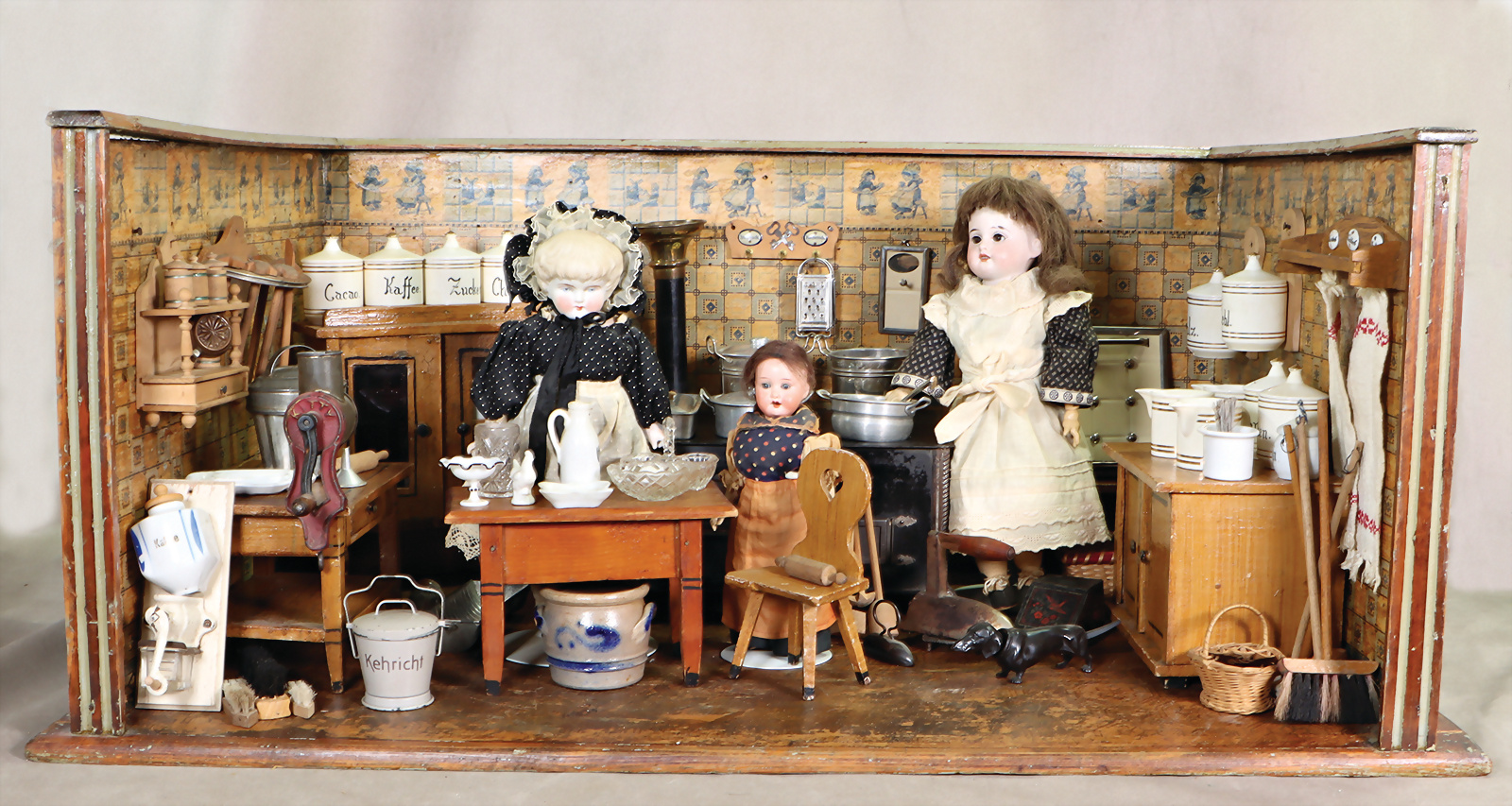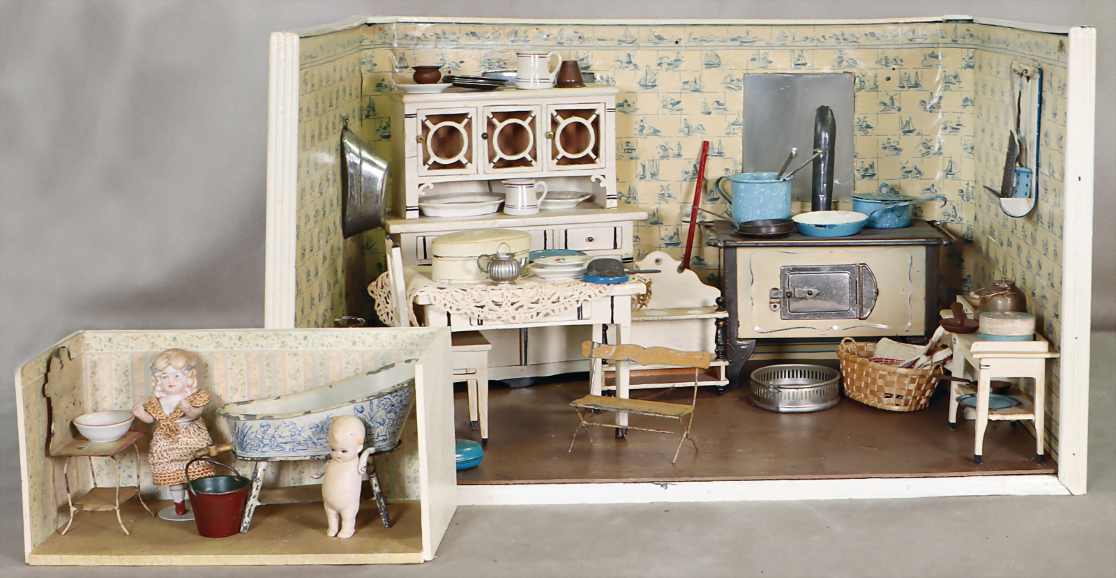 Puppenstuben-Küche, ca. 1910, B: 78 cm, H: 37 cm, T: 52 cm, möbliert, reichh. Zubehör, mit Puppen, nur an Selbstabholer