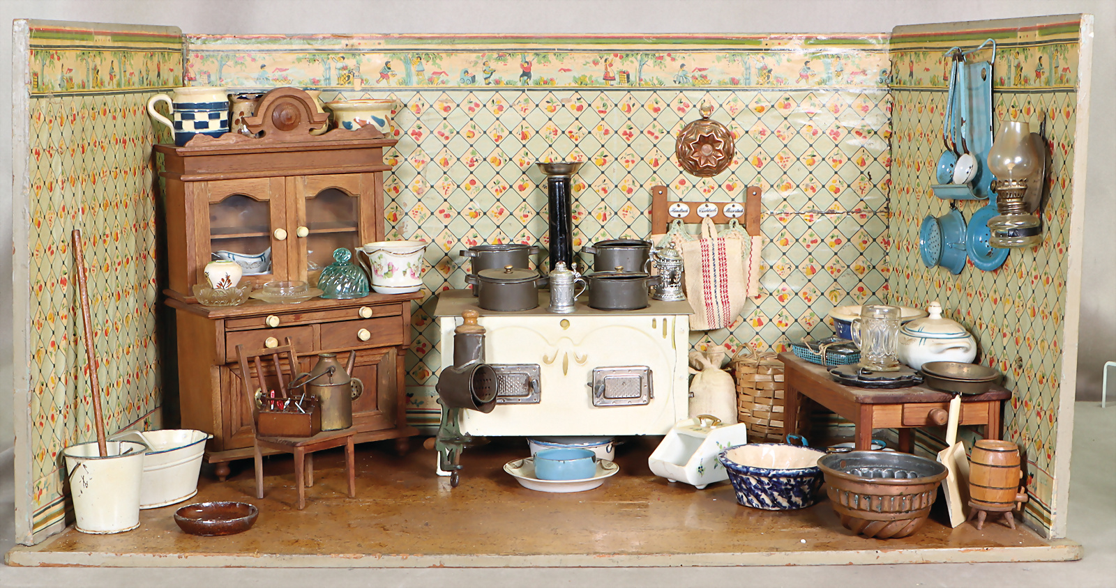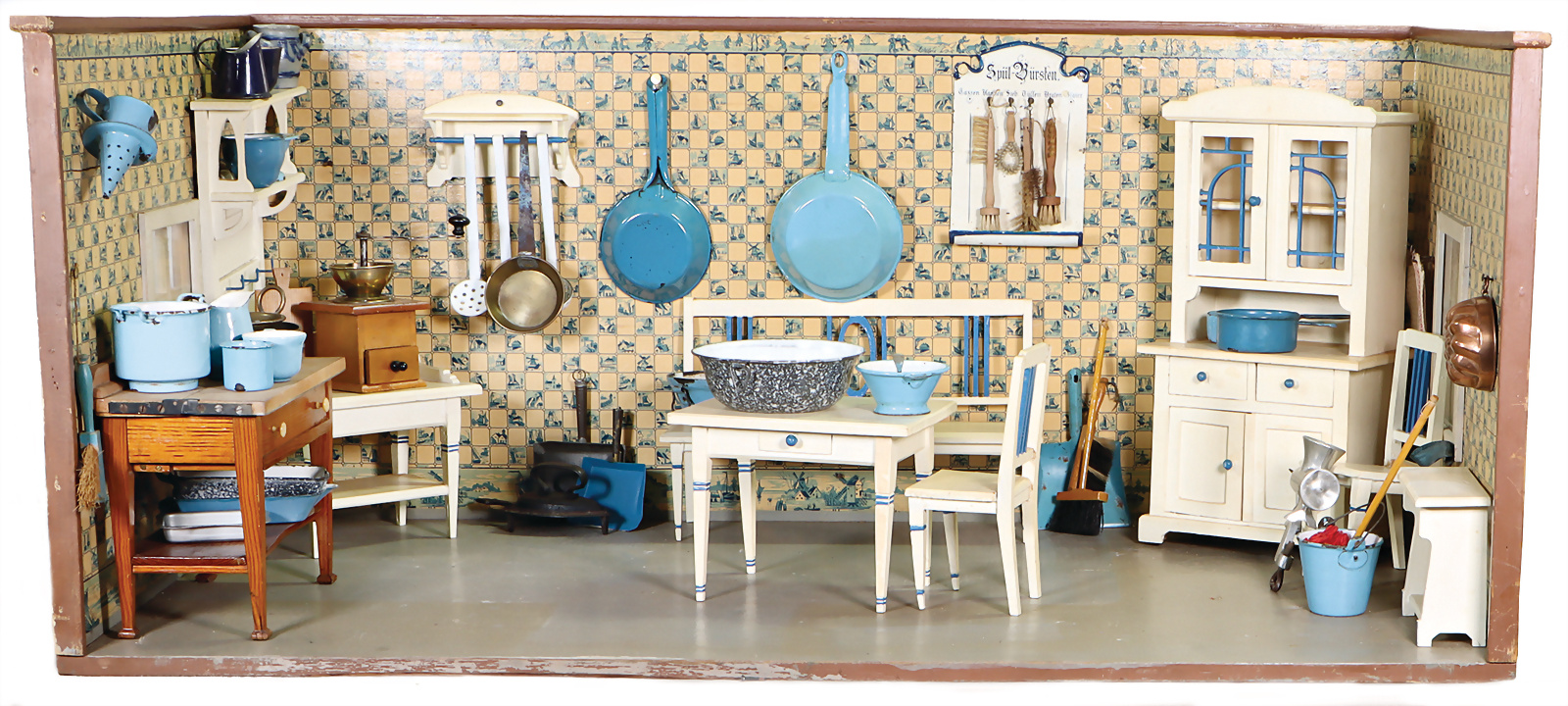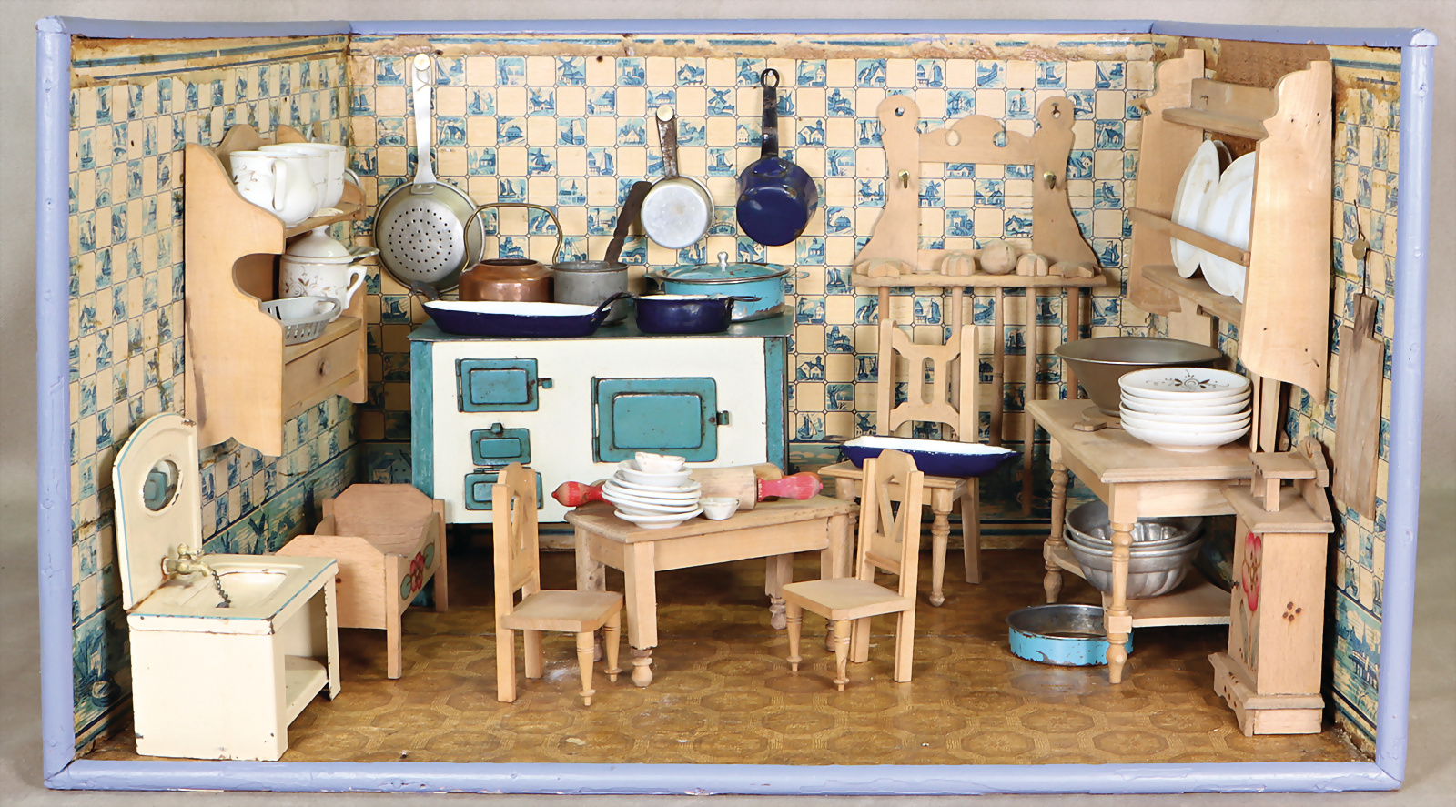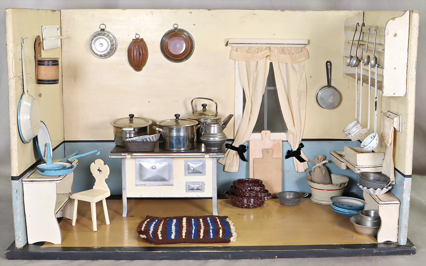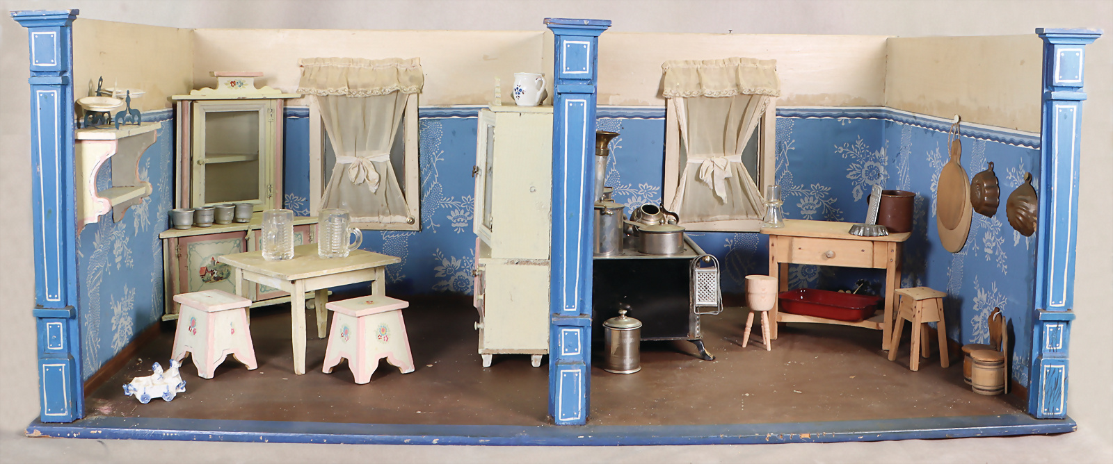 Puppenstuben-Küche, ca. 1910, H: 36,5 cm, B: 66 cm, T: 43 cm, möbliert, mit Zubehör u. Herd, Tapete Delfter Kachelmuster, keine Bodentapete, außen 1x überstrichen, besser Selbstabholer