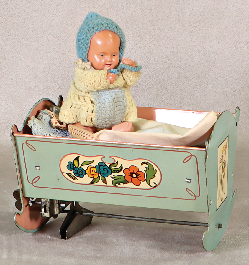 Wiege, Blech, lithogr., 15,5 cm, mit kl. Celluloid-Puppe, Uhrwerk intakt, guter Zust.