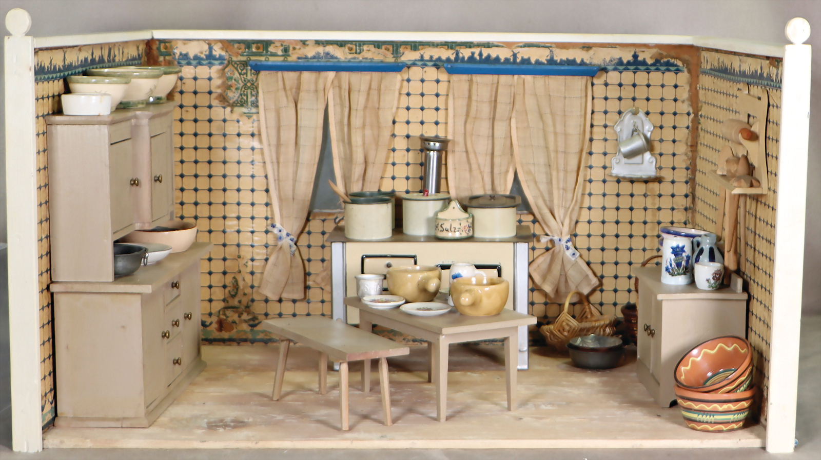 Puppenstuben-Küche, ca. 1910, B: 111 cm, H: 49 cm, T: 56,5 cm, 2 Fenster, Tapete Delfter Kachelmuster, einige Teile Möbel, nur an Selbstabholer