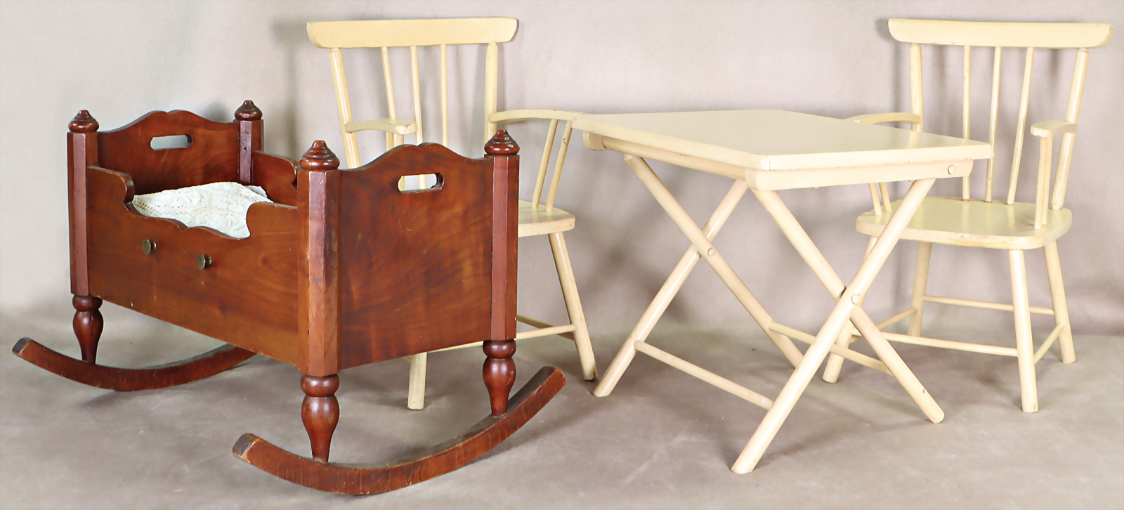 Konv. Dekorationsteile, Klapptisch, Stühle, Kinderwiege, 43,5 cm, bitte Transportaufwand beachten