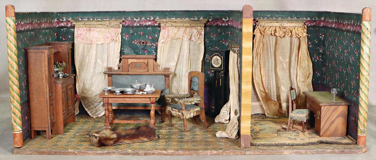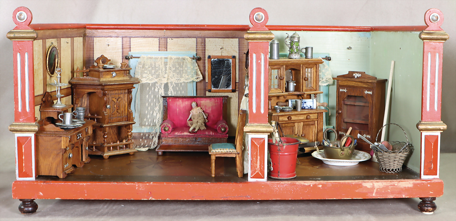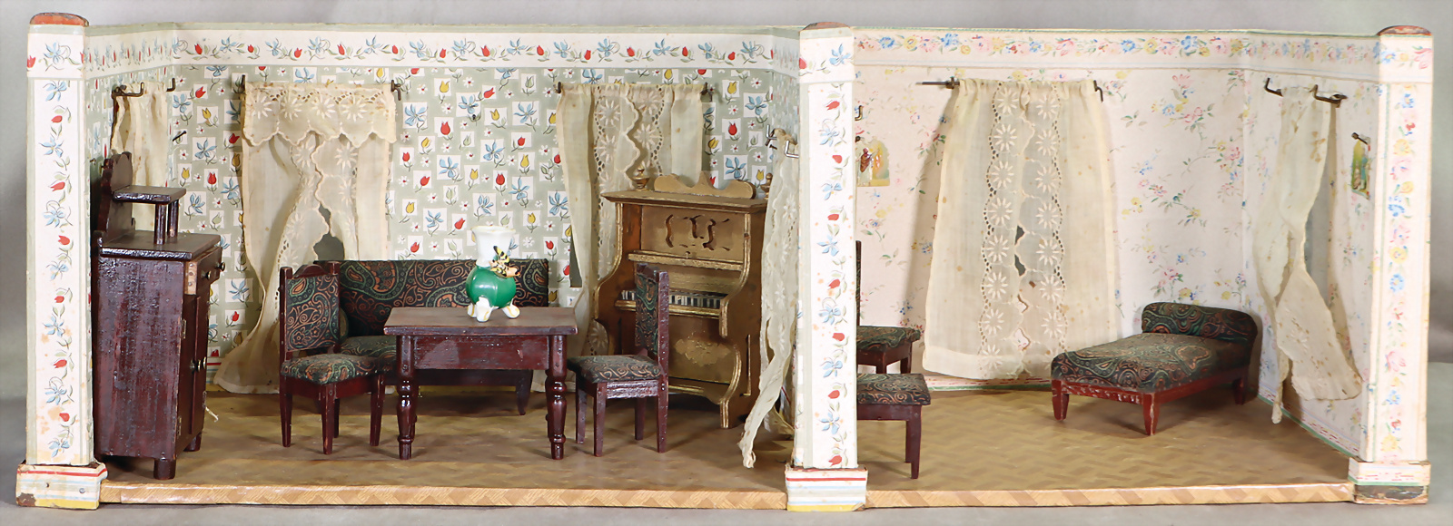 2-tlg. Puppenstube, B: 77 cm, H: 32 cm, 3 Fenster, Durchgang, um 1910, alte Tapete an Wand u. Boden, möbliert, schöner gestickter Teppich