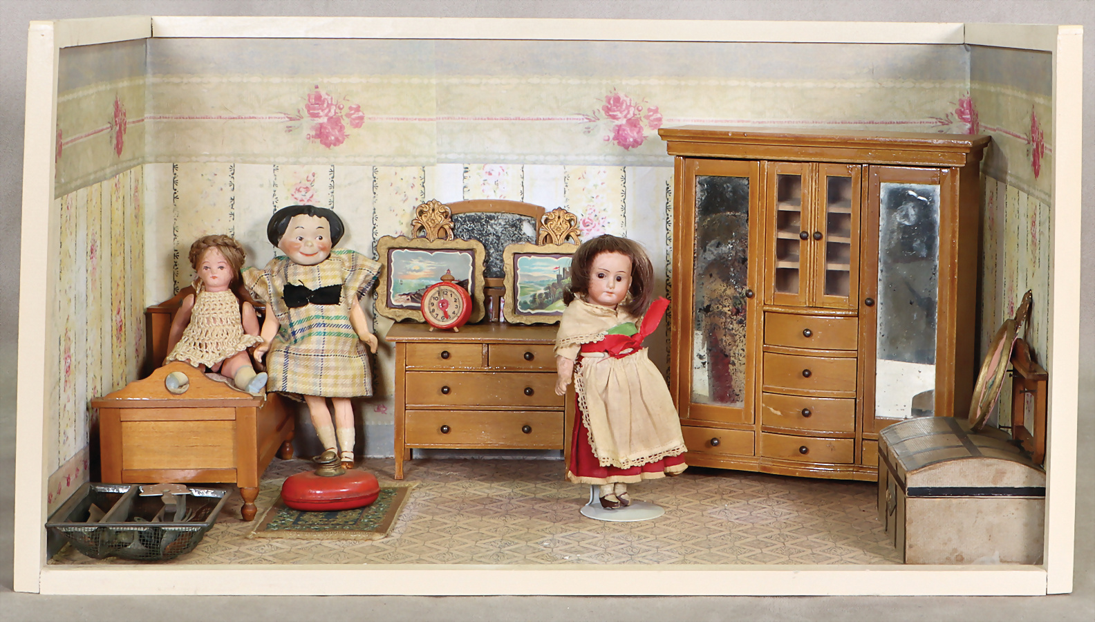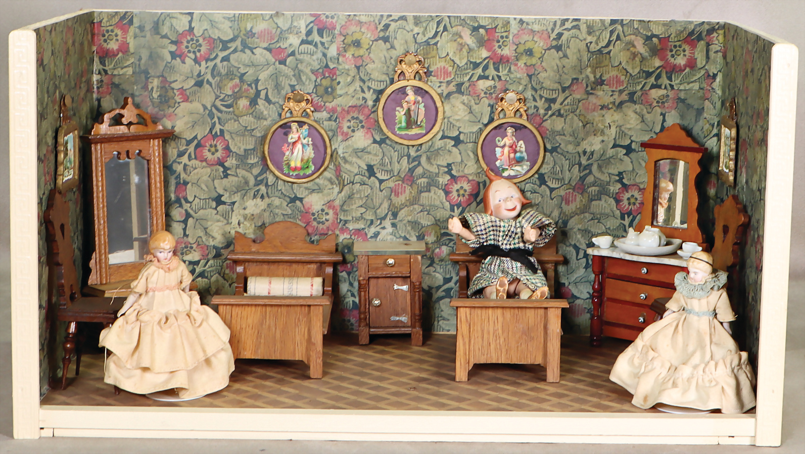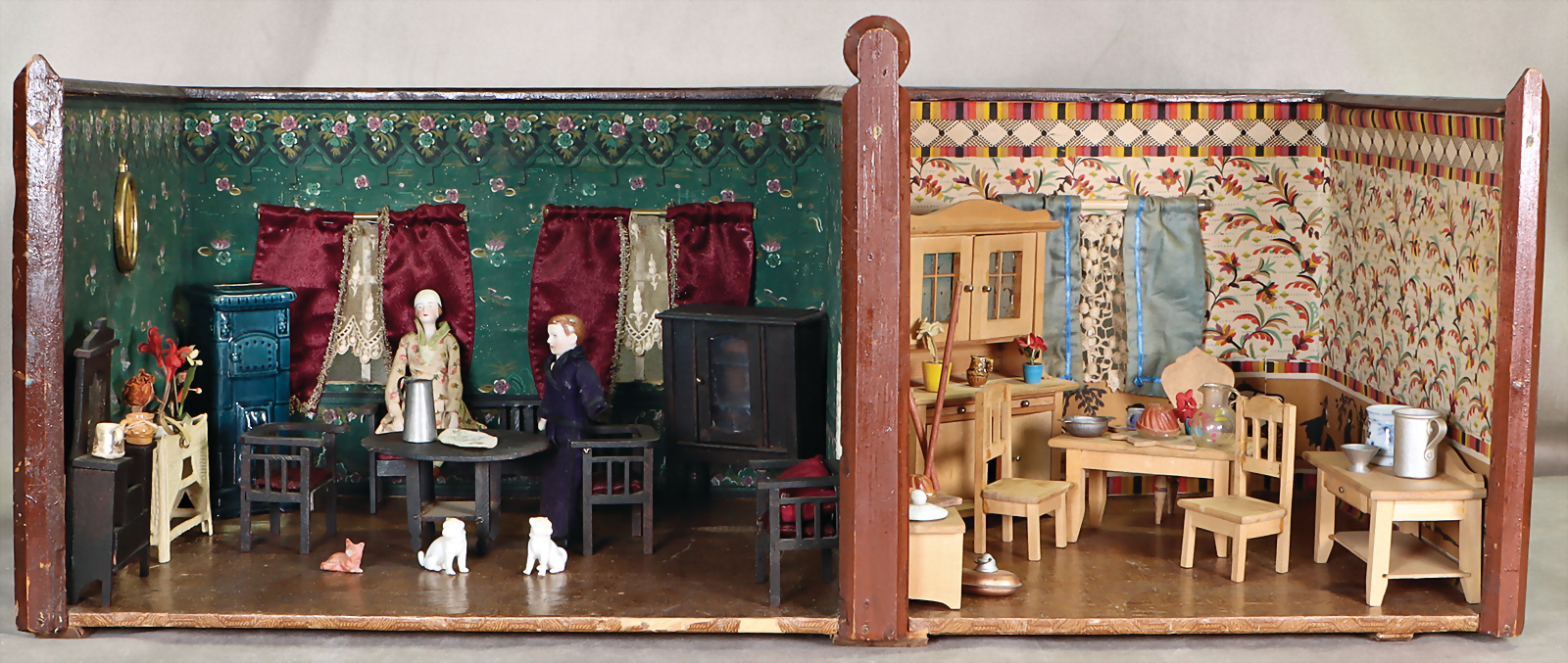 2-tlg. Puppenstube, B: 77 cm, H: 32 cm, 3 Fenster, Durchgang, um 1910, alte Tapete an Wand u. Boden, möbliert, schöner gestickter Teppich