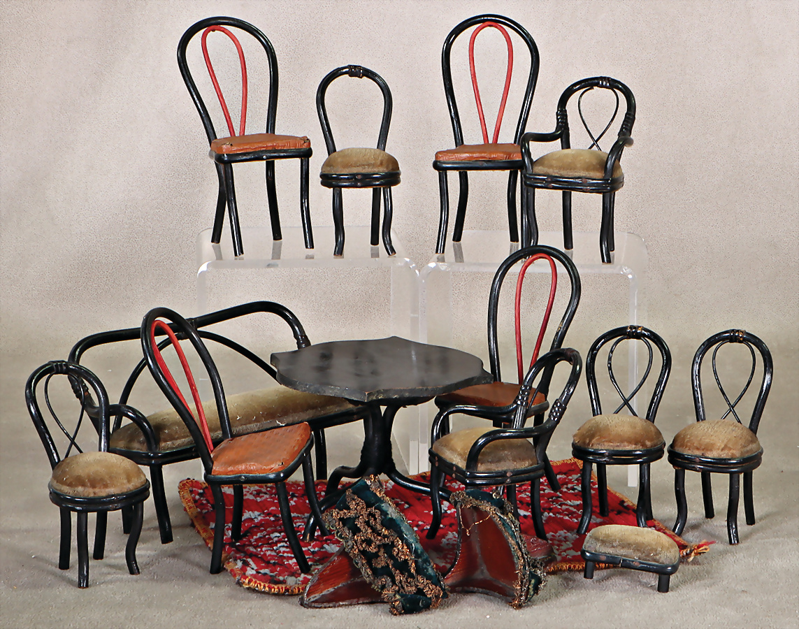 Tournette, Puppenstuben-Möbel, mit Bank, B: 14 cm, Stühle, Tisch, Hocker