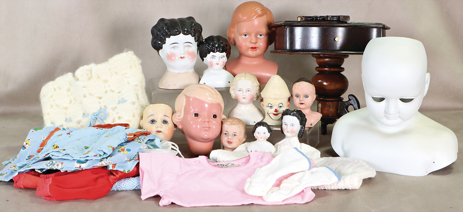 Konv. Puppenköpfe, Celluloid, Masse, Porzellan, untersch. Zeit, teils alt, teils neuer, dazu Puppenkleidung, 1 Puppentisch mit Schublade, H: 22 cm