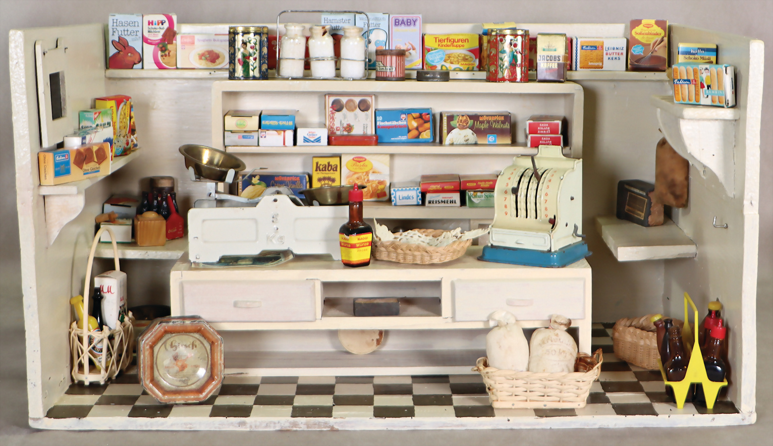 Kaufladen, ca. 1940, B: 36 cm, H: 30 cm, T: 31 cm, Bastelarbeit, mit Zubehör