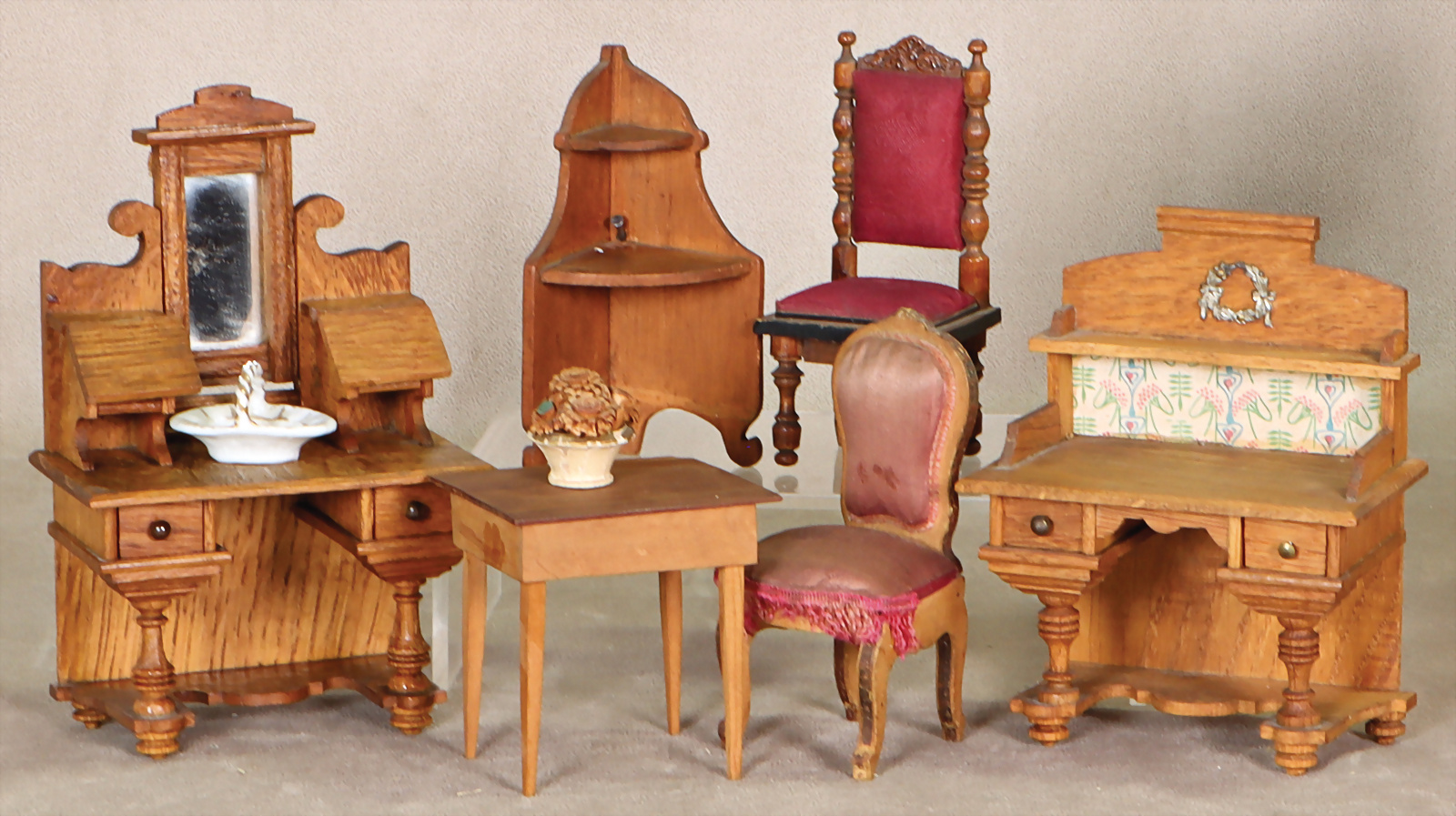 Puppenstuben-Möbelprogramm, Schreibtisch mit Spiegel, H: 15 cm, Stühle, Tisch, Eckregal