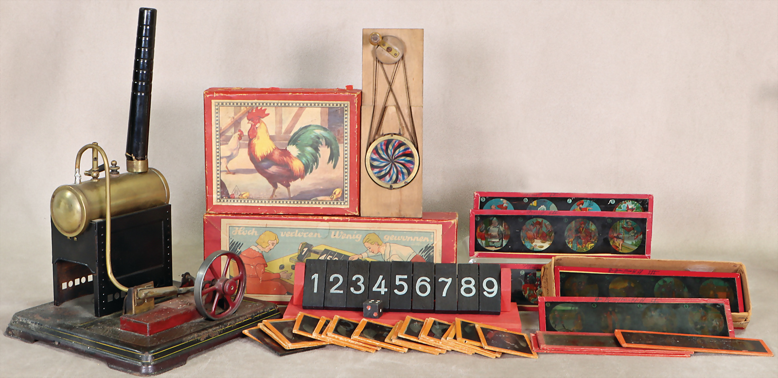 Konv. kl. Dampfmaschine, BING, Grundplatte 18x18 cm, oszillierender Zylinder, Pfeife, ohne Brenner, Schornstein ergänzt, einige Laterna Magica Glasbilder, Rechenspiel, Würfel-Legspiel