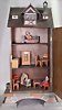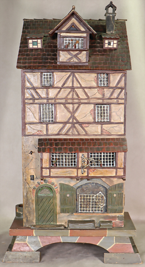 Puppenstuben-Haus, wohl um 1900, H: 60 cm, B: 41 cm, aufw. gestaltete Fassade, vorne zum Öffnen, innen möbliert, dekorativ