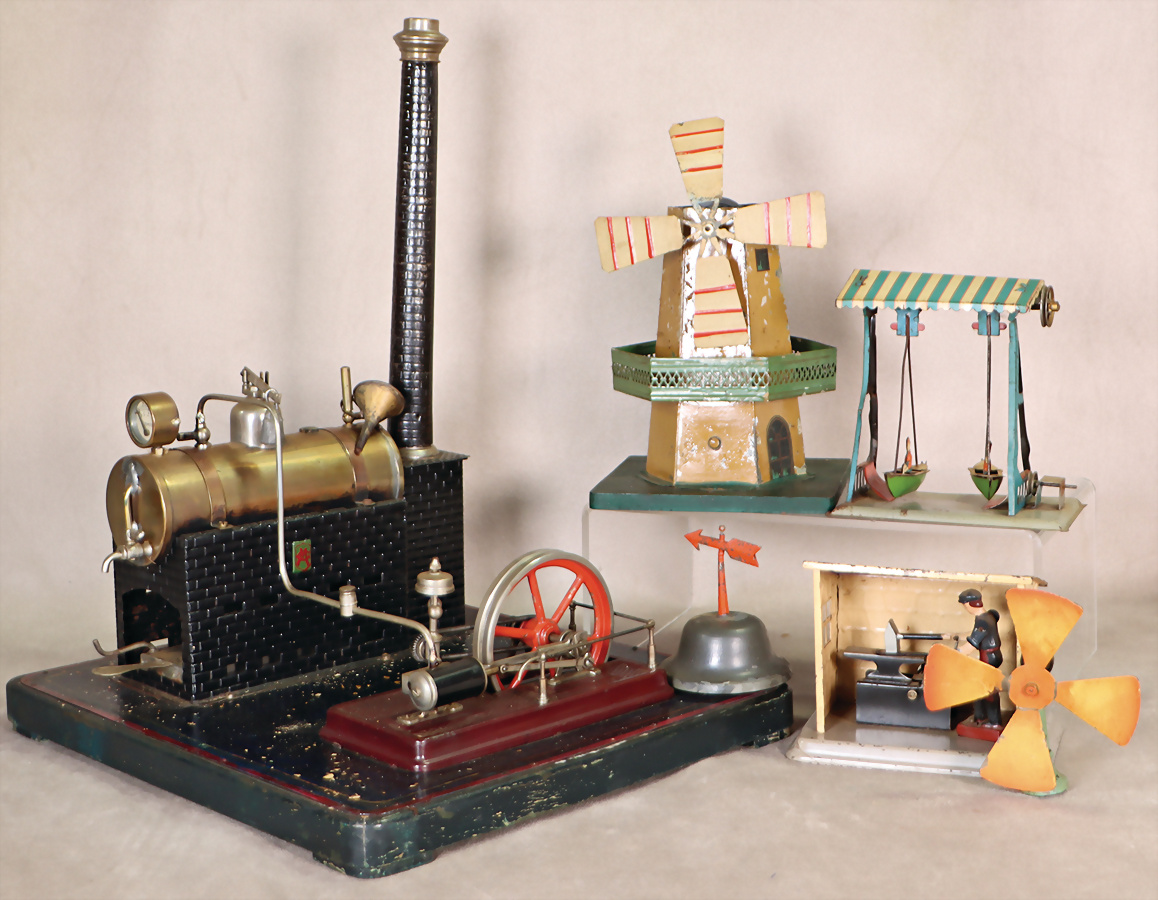Liegende Dampfmaschine, wohl DOLL, auf Holzbrett montiert, Grundplatte 31,5 x 34,5 cm, Fliehkraftregler, Pfeife, Thermometer, Wasserstandsglas wurde entfernt, mit Brenner u. Schornstein, techn. nicht geprüft, Windrad, Antriebsmodelle, Schaukel, Windmühle, bespielt, teilw. Lackfehler
