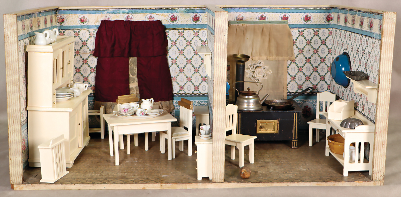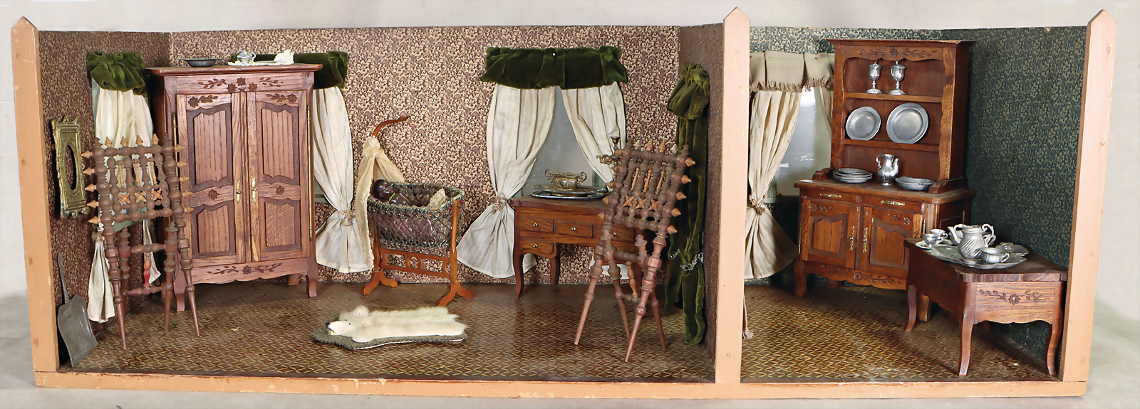 2- tlg. Puppenstube, Wohnstube u. Küche, B: 79 cm, H: 32 cm, 3 Fenster, ohne Fensterglas, Durchgangstür, alte Tapete, möbliert, mit Zubehör, bitte Transportaufwand beachten