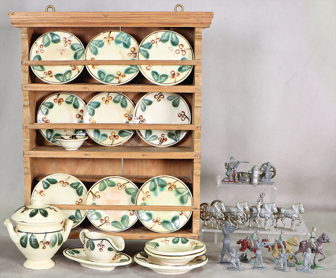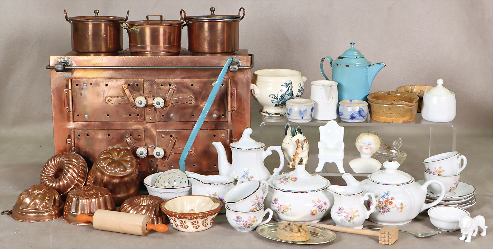 Konv. Porzellan, Service-Teile, 1 Brustblattkopf auf Brustplatte, H: 5,5 cm, Osterhase mit Ei (geklebt, Fehlstellen), 1 Kaffee-Service, Blech, Glas u. Keramikteile, einige Backformen Kupfer, 1 Herd Kupfer, B: 31,5 cm, 1 Topf nicht original