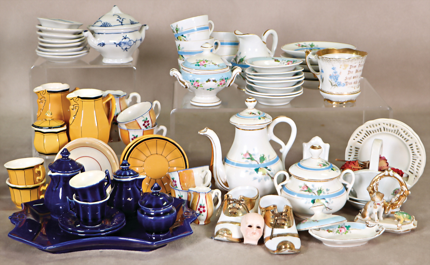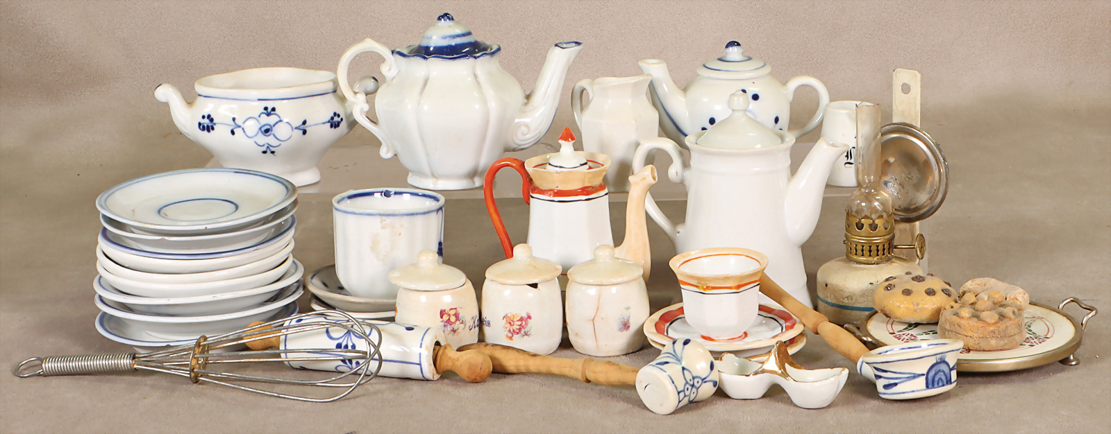 Puppenküchen-Zubehör, Porzellan, Blech, Gewürzdosen, Leuchter, Kleinteile, mittlere Gr.