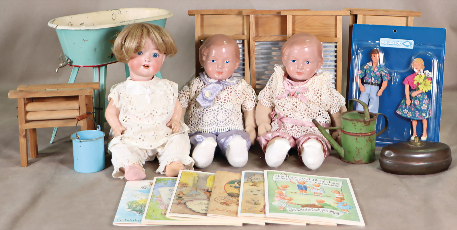 Badewanne, Blech, Wäschereiben, Mangel, 2 SCHILDKRÖT Puppen Replica, einige SCHILDKRÖT Hefte, neuerer Druck, 1 Porzellankopf-Puppe, HEUBACH KÖPPELSDORF, 320, 32 cm, Augen nachtr. fest einges., Sitzbaby-Körper, Körper ausgebessert, 1 Finger fehlt