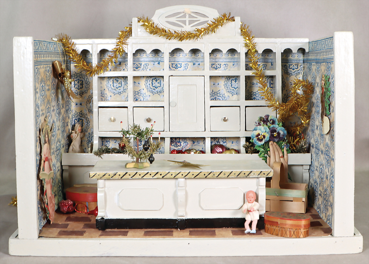 Puppenstuben-Küche, ca. 1910, B: 78 cm, H: 41 cm, alte Tapete, mit Zubehör, mit Herd