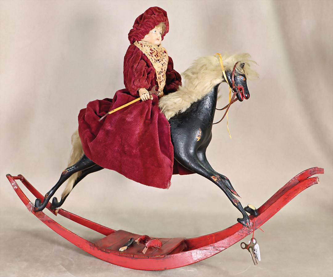 Puppe auf Schaukelpferd, H: 51 cm, Alter?, Uhrwerk intakt, Hufe gebrochen, Kopf Masse, gemalte Augen