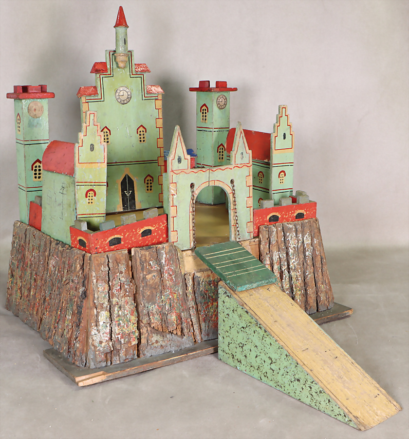 Ritterburg, um 1900, Holz, farbig gefasst, Manufakturarbeit, außen mit Baumrinde beplankt, Grundplatte 44x32 cm, Orig.-Zust., Orig.-Bemalung, mit Rampe