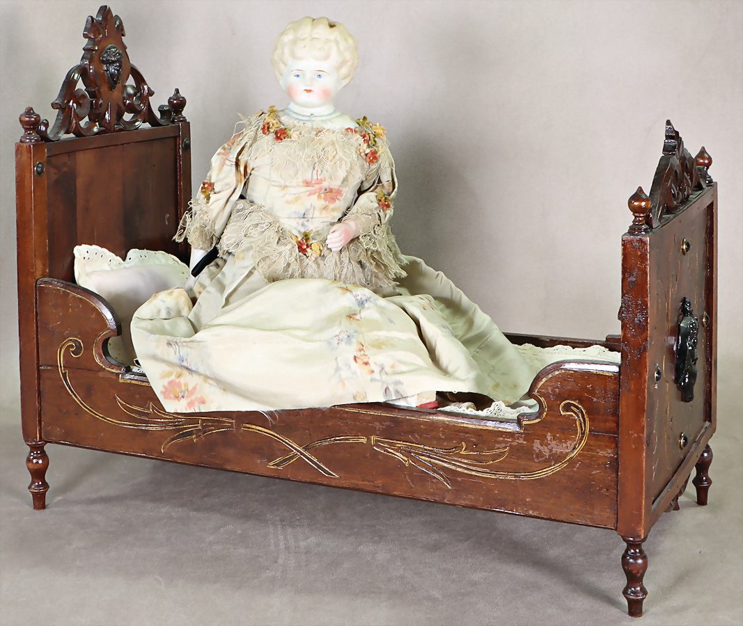 Puppenbett, B: 50 cm, H: 41 cm, 1x Parian, Brustblattkopf-Puppe, 44 cm, ausmodell. Haare, blaue gemalte Augen, anmodell. Kragen, Kopf zerbrochen u. geklebt, Lederkörper, Porzellan-Unterarme