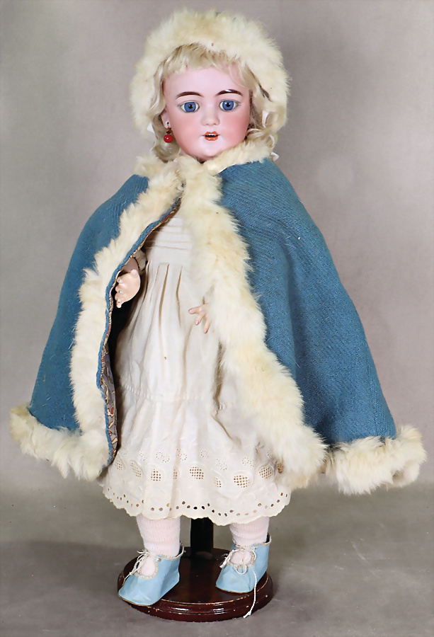 109-10½, 49 cm, Kurbelkopf, blaue Schlafaugen, off. Mund, oben Zähne, durchst. Ohren, Gliederkörper, alte Mohair-Perücke, minimal. Perücken-Pull am Hinterkopf