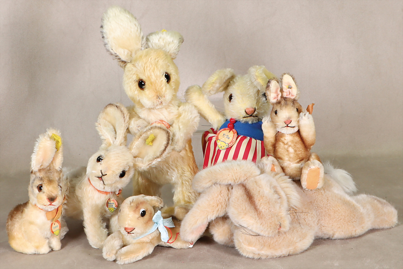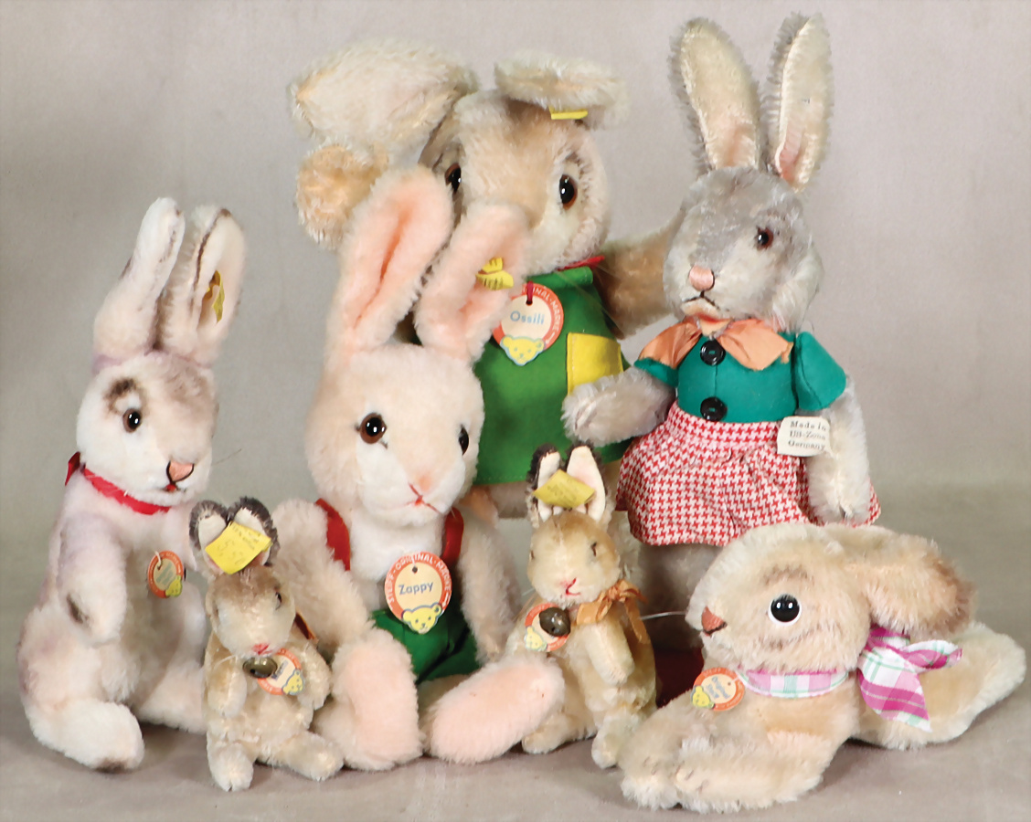 Hasen, Nachkrieg, liegend, kompl., Nr. 2312.00, Ossili, kompl. STEIFF, Nr. 7800/30, Manni, Nr. 4312.02, Hase sitzend, 22 cm, kompl., Nr. 3040/17, Hasenfrau, mit Knopf u. gut erhaltener US-Fahne, Zappy, kompl., Nr. 7800/25, guter Zust.