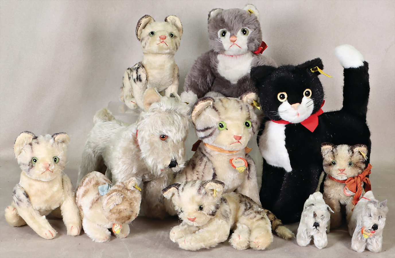 Konv. Nachkrieg, Hunde u. Katzen, meist mit Knopf u. Fahne, 1x Kitty, kompl., Nr. 5322.00, Snurry, kompl., Nr. abgegriffen, 1 Werfkatze, Susi, kompl., Nr. schwach erkennbar, sonst teils mit Knopf oder Schild, meist guter Zust.
