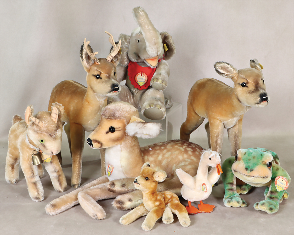 Froggy, kompl., Nr. schwach erkennbar, Jumbo, kompl., Nr. 4322.00, Zicki, kompl., Nr. 8322.0, Kuschi, kompl., liegendes Rehkitz, kompl., Nr. 2635.00, sonst Knopf u. Fahne, oder ohne Knopf u. Fahne