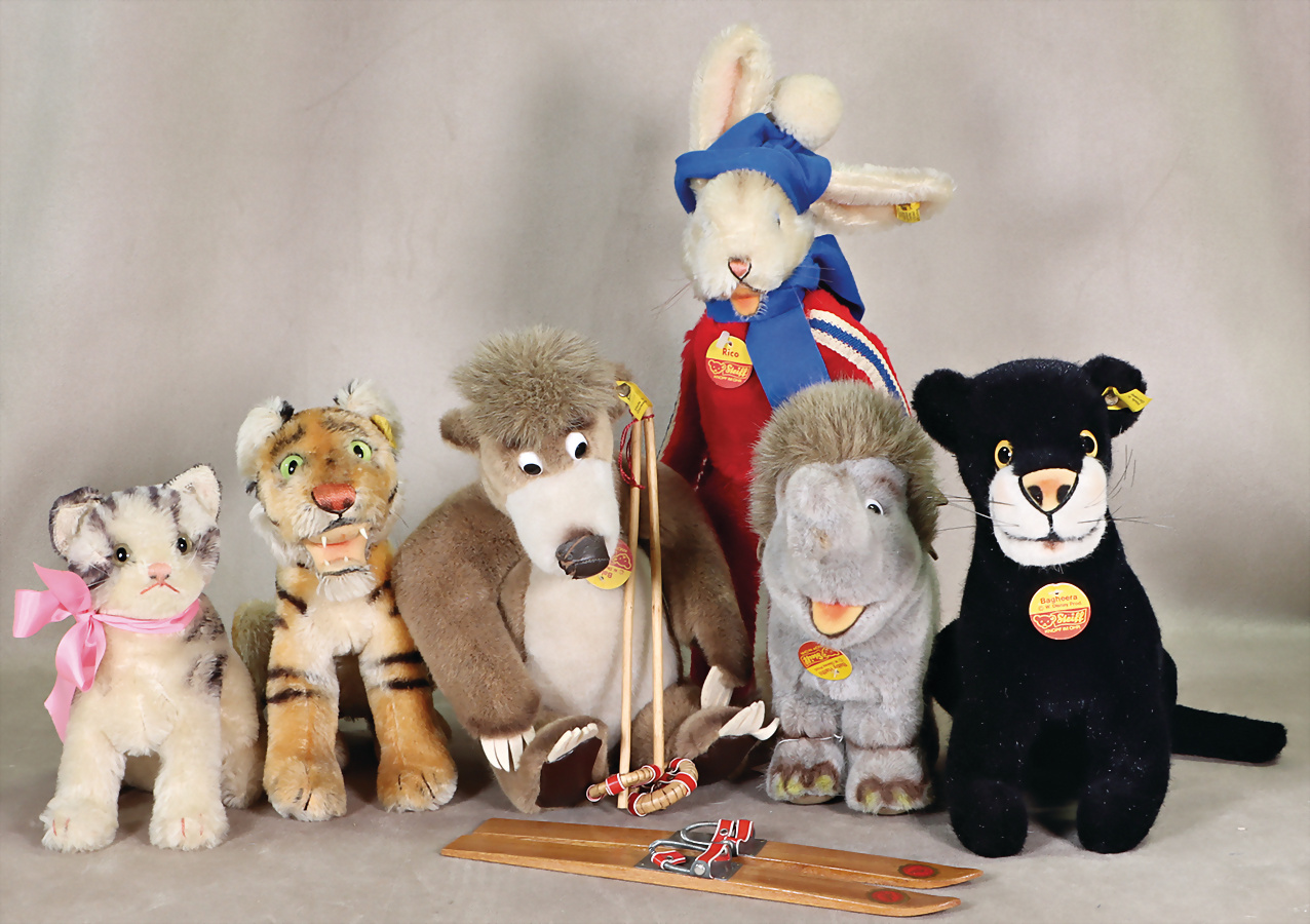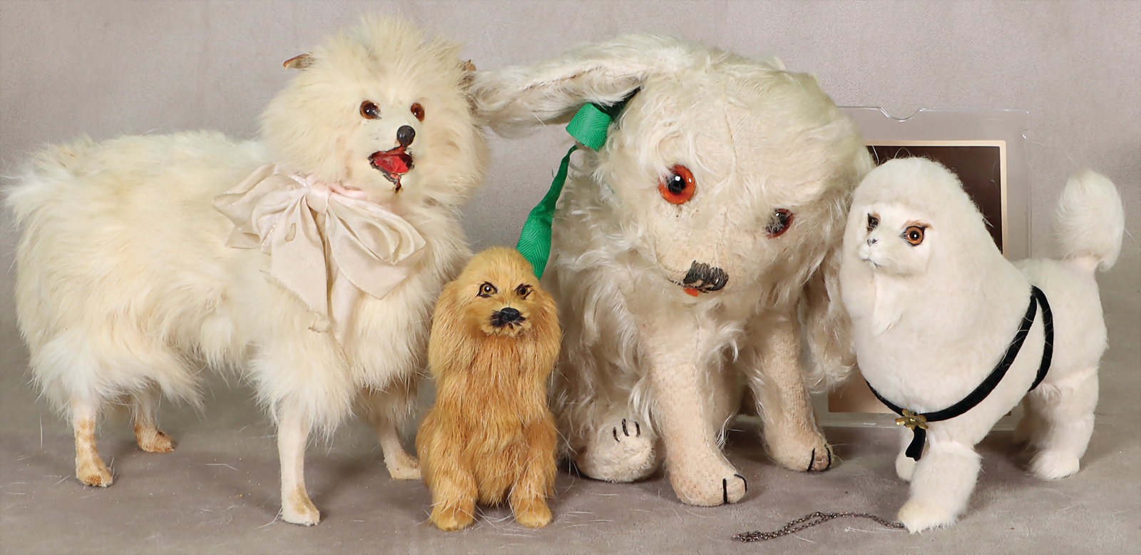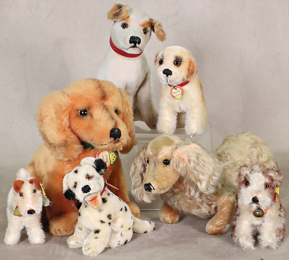 Konv. Nachkrieg, Cosy Bazi, kompl., Nr. 5030/20, Bernie, mit Knopf u. Schild, Molly, kompl., Nr. 3310.00, Dally, kompl., Fahne verschlissen, Foxy, kompl. Nr. 1310.00, Electrola-Fox, ohne Knopf u. Schild, Dackel, ohne Knopf u. Schild