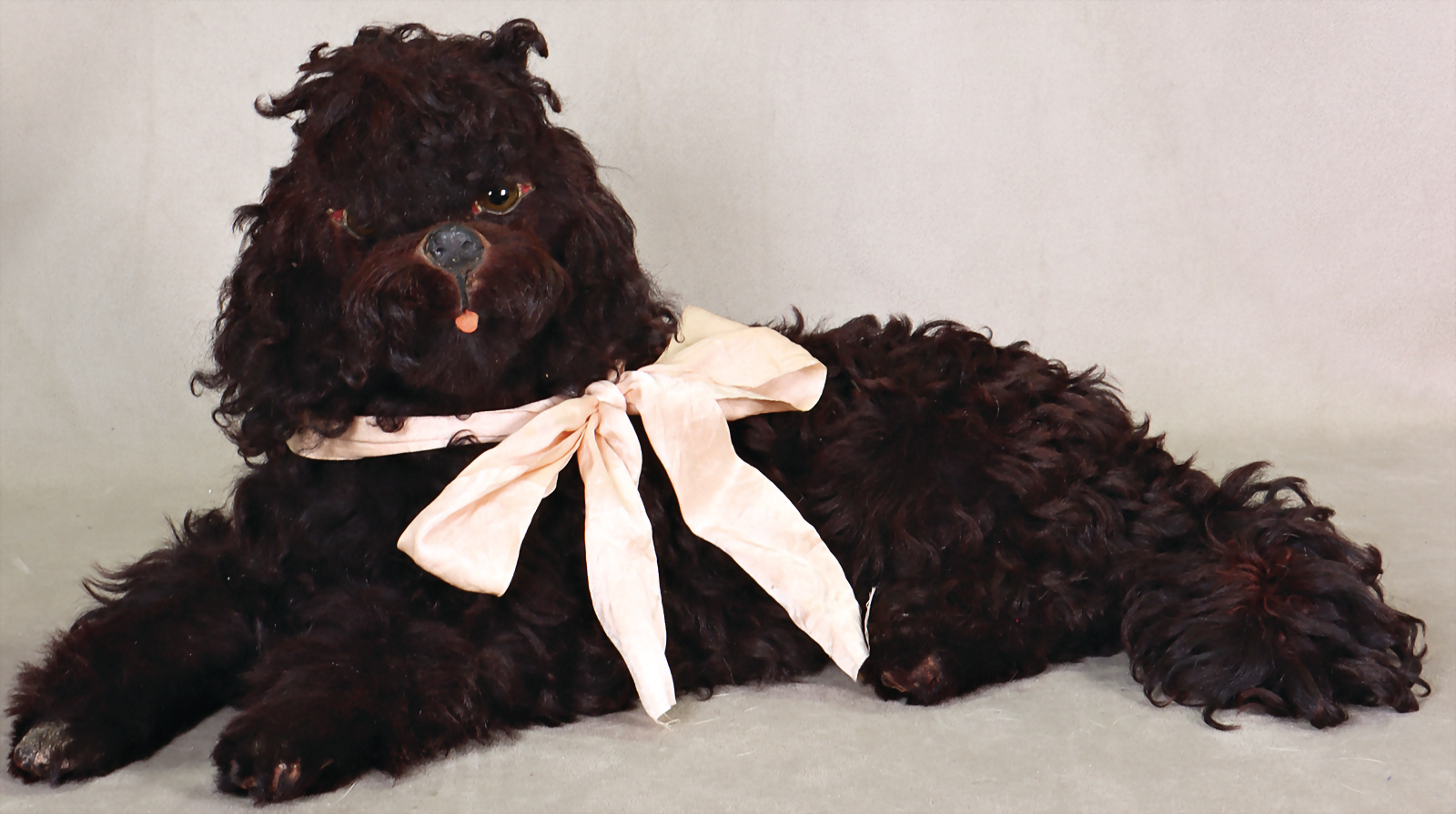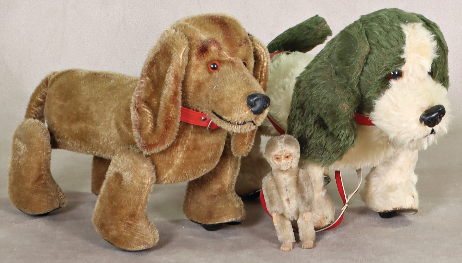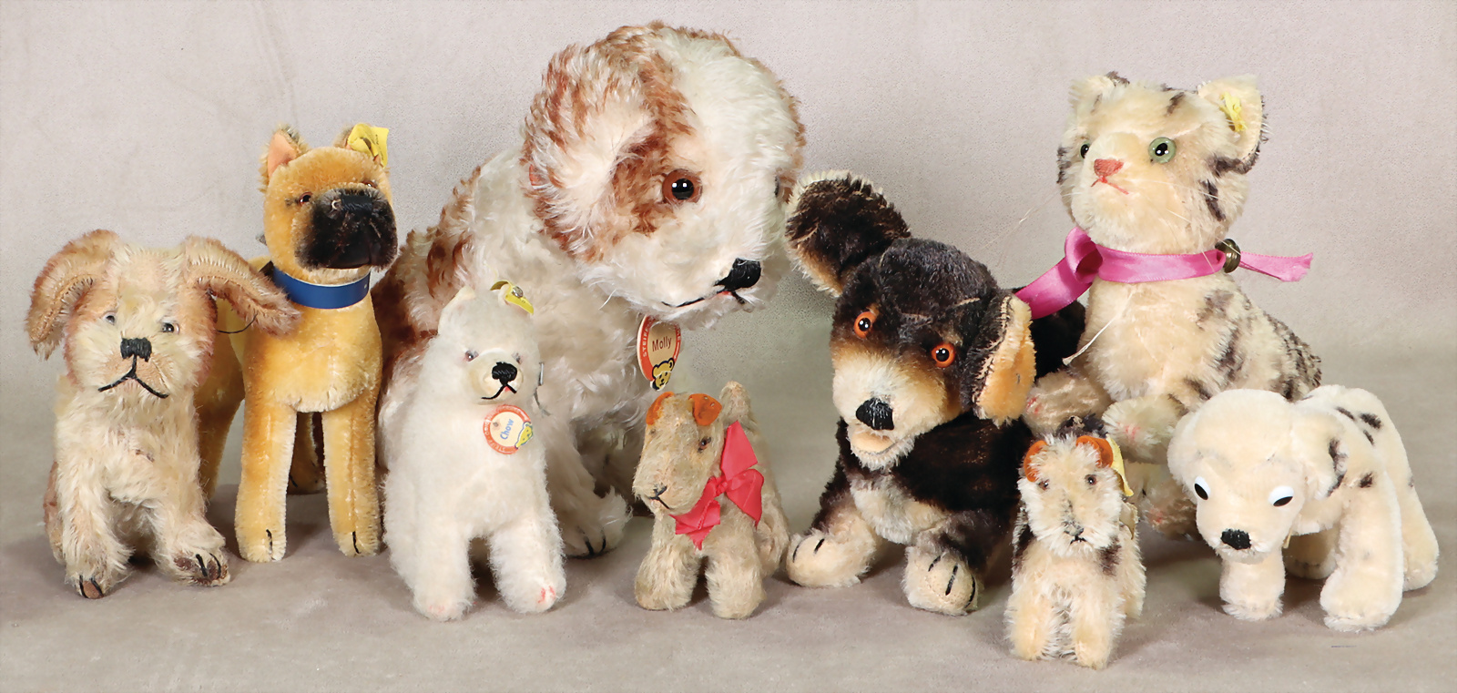 Konv. Nachkrieg, Cosy Bazi, kompl., Nr. 5030/20, Bernie, mit Knopf u. Schild, Molly, kompl., Nr. 3310.00, Dally, kompl., Fahne verschlissen, Foxy, kompl. Nr. 1310.00, Electrola-Fox, ohne Knopf u. Schild, Dackel, ohne Knopf u. Schild
