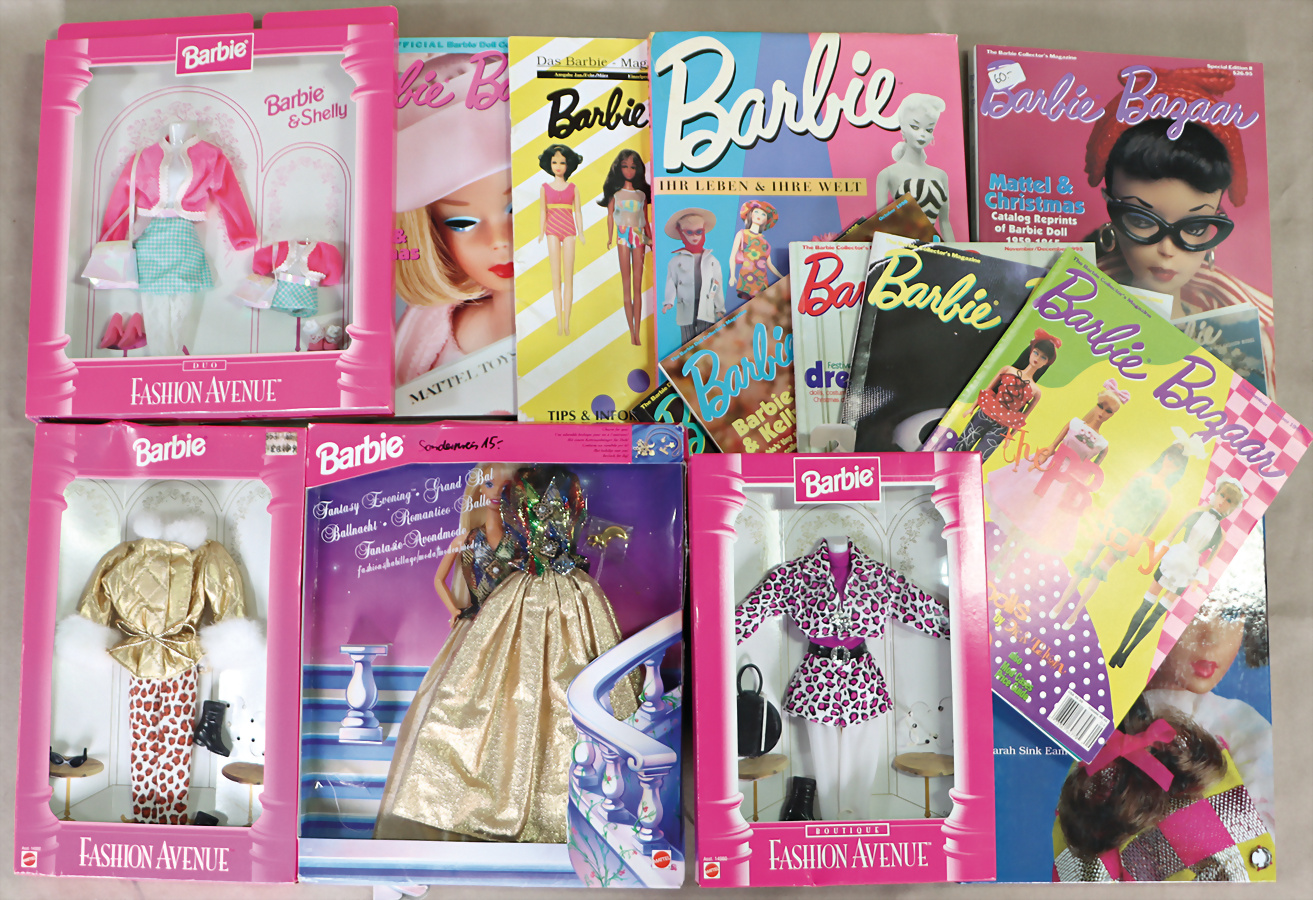 Konv. Barbie, Zeitschriften, Bücher, 4 Outfits Fashion Avenue, 3 Teile, sowie 1 Outfit Fantasy Evening, Grand Ball, neu im Kart.