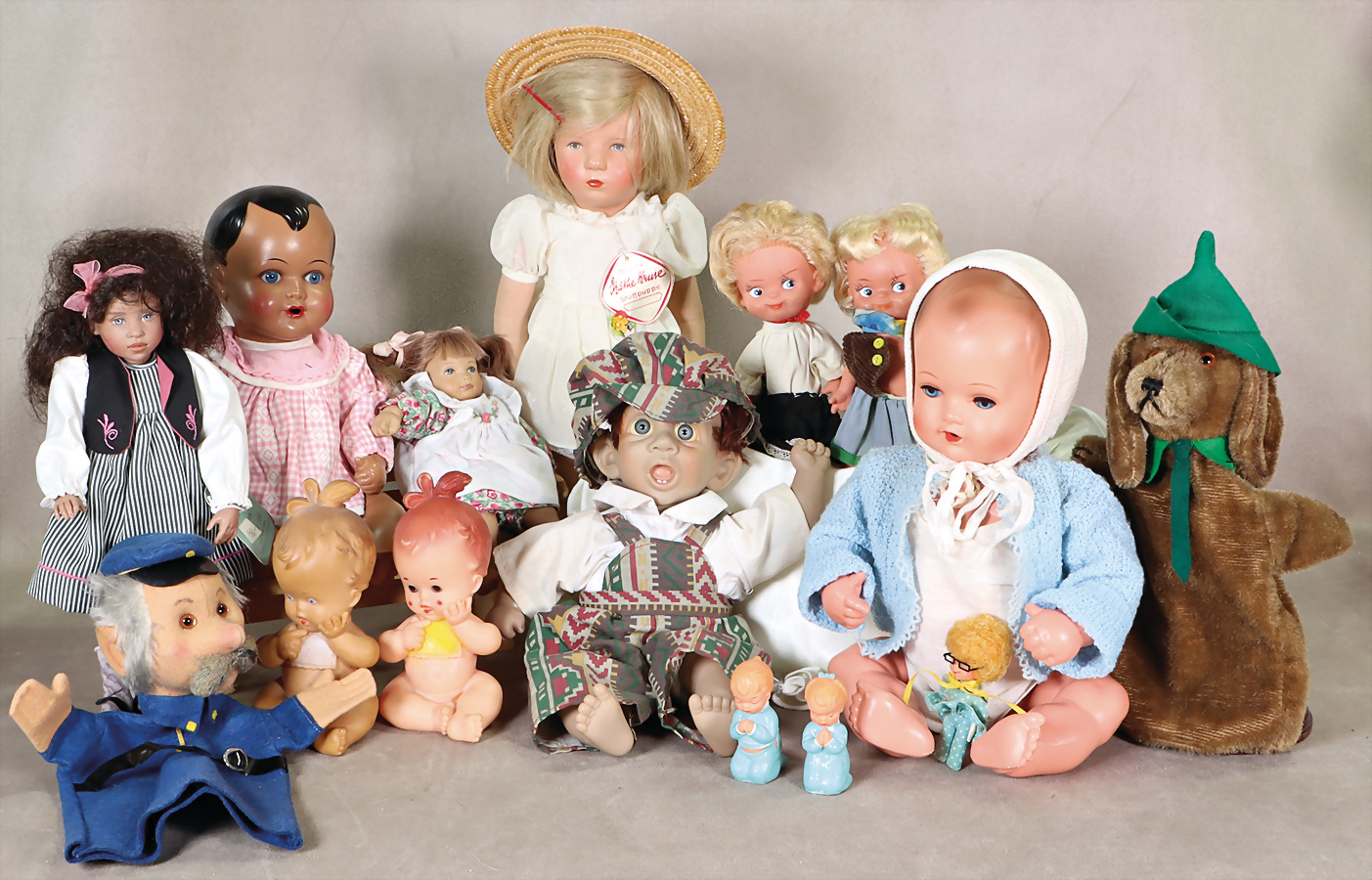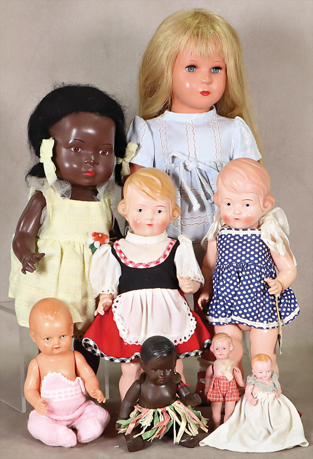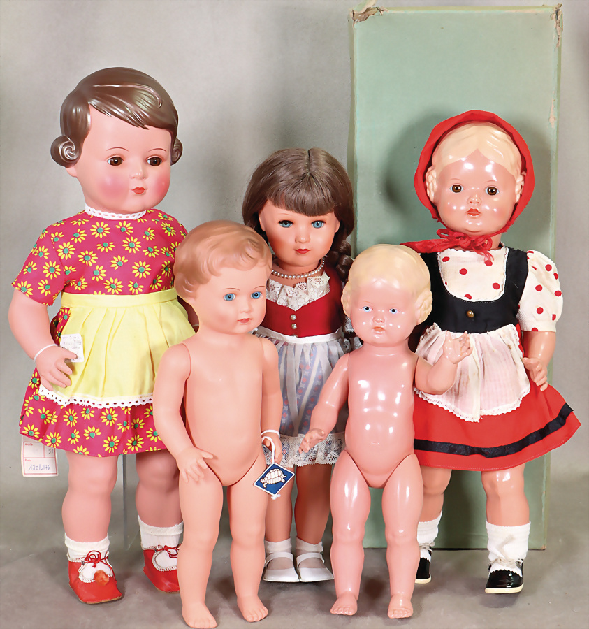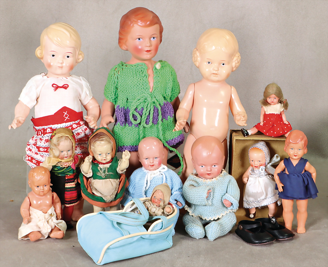 Konv. Puppen, neuere Produktion, meist Celluloid oder Tortulon, SCHILDKRÖT u.a., darunter rote Guste, 28½ cm, Bärbel, 25½ cm, Inge, 25½ cm, Strampelchen, mehrere kl. Puppen, bitte Transportrisiko für Celluloid beachten