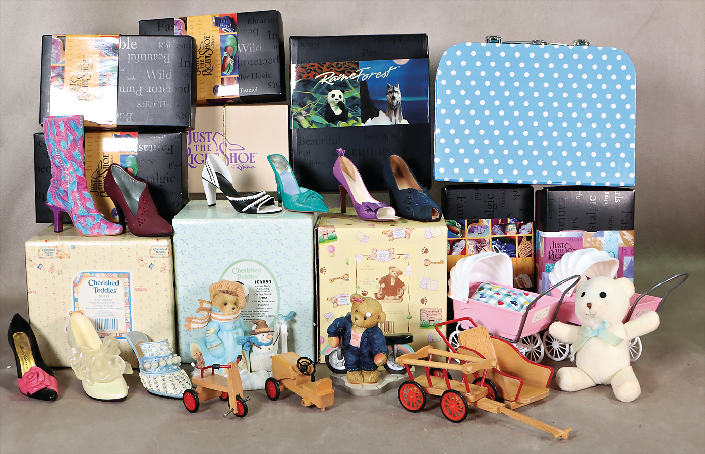 Gr. Konv. kl. Modell-Schuhe, Just the right Shoe, einige neuere Produktion, einige Puppenstuben-Möbel, einige Sammlerbären, im Orig.-Kart., neuere Produktion, 1 Umzugskarton