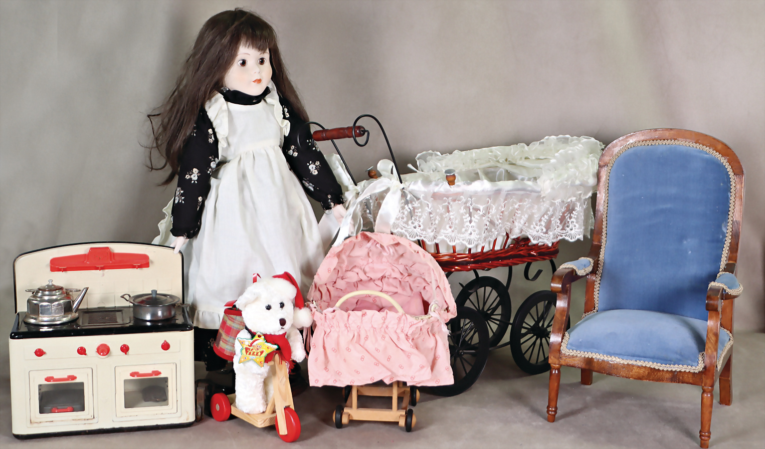 Fundkiste, Puppenwagen, Bär auf Roller, Künstlerpuppe, 1 Herd, 50er/60er Jahre