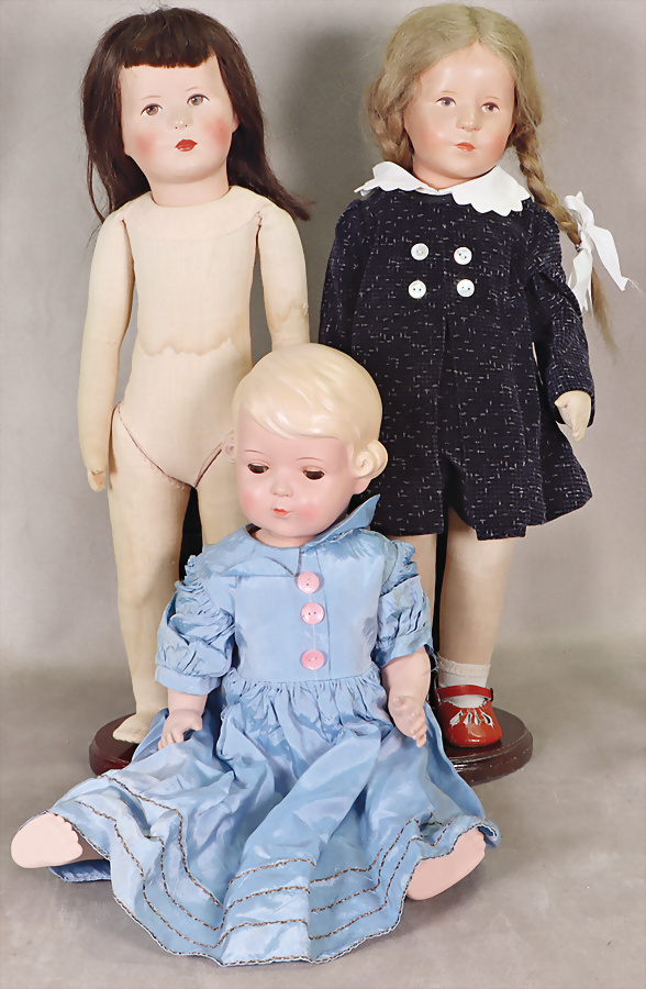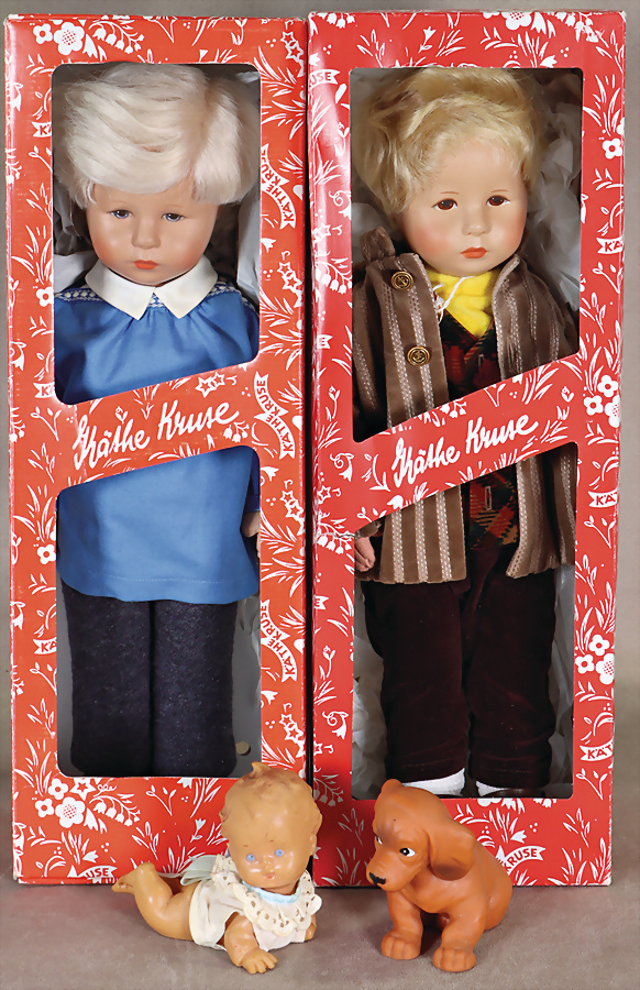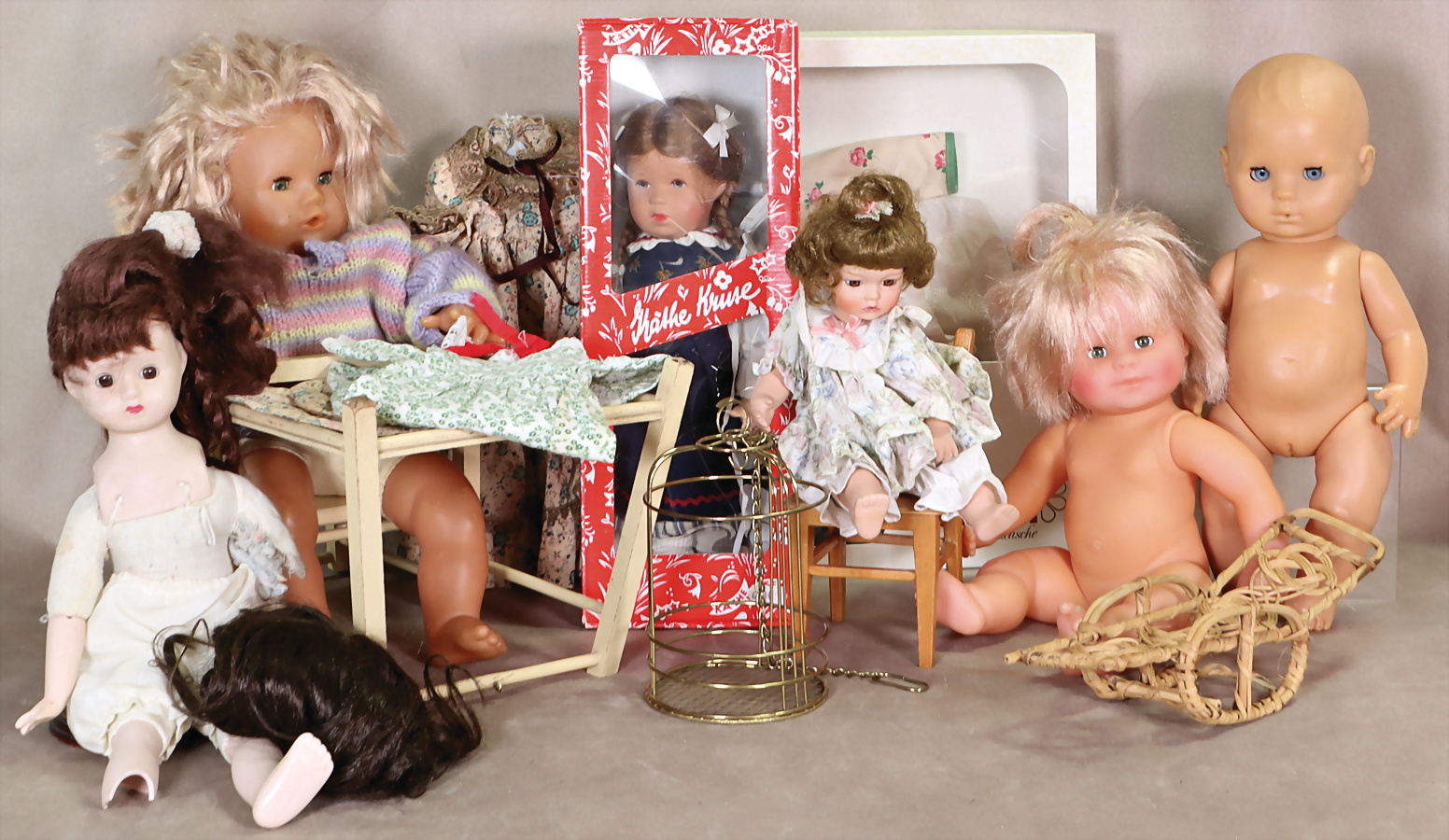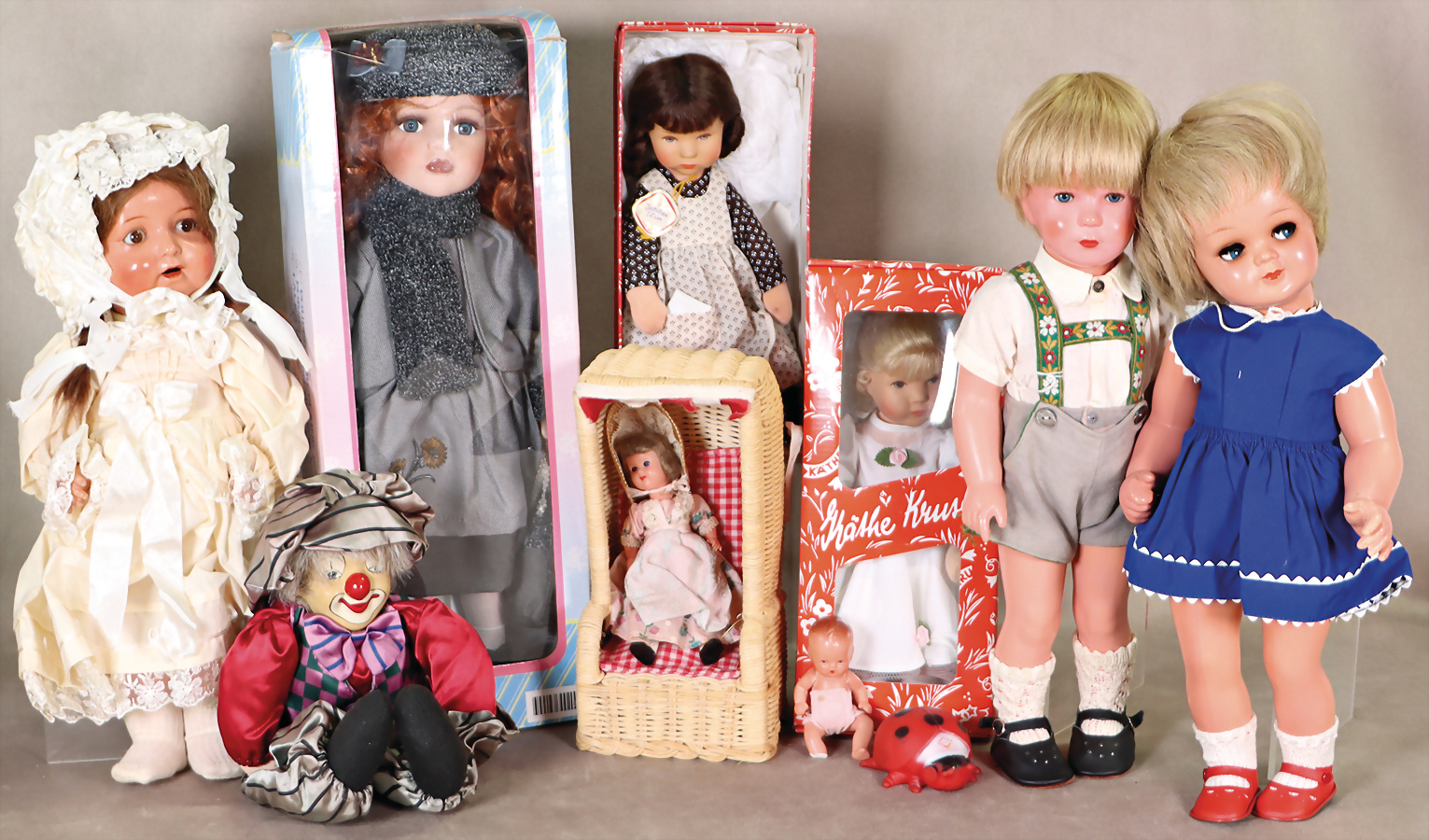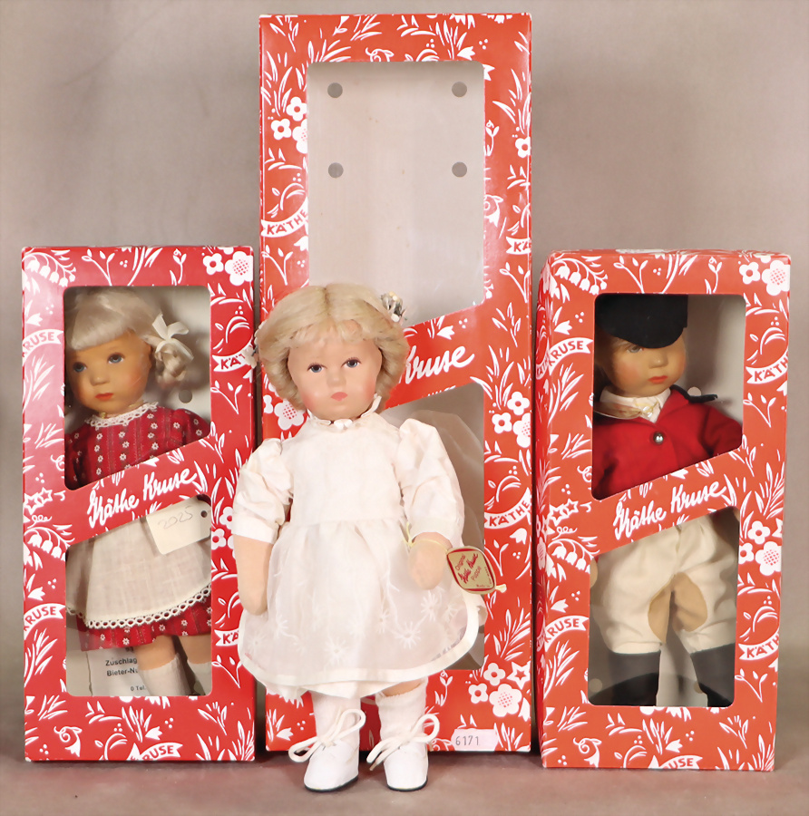 Nachkrieg, Mädchen, 50 cm, Kunststoffkopf, Farbunterschied an der Halskrause, optisch sehr guter Zust., evtl., 1x bei KÄTHE KRUSE überarbeitet, KÄTHE KRUSE, Hampelchen, Kopf Tortulon, 47 cm, lose angenähte Arme u. Beine, KÄTHE KRUSE Mädchen, 50 cm, deutlicher Farbunterschied an der Halskrause, Kopf evtl. 1x bei KÄTHE KRUSE überarbeitet, 1 Däumelinchen, neuere Produktion