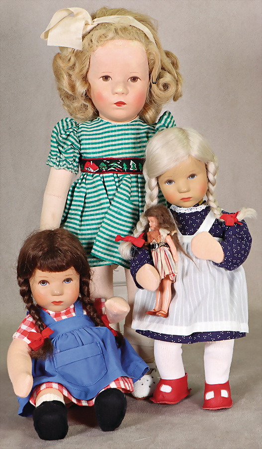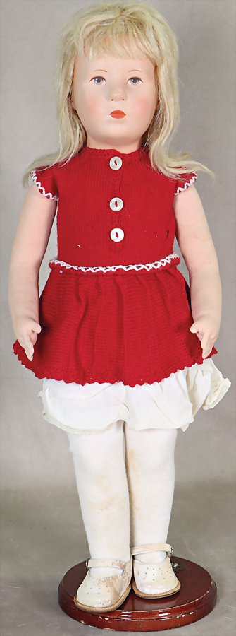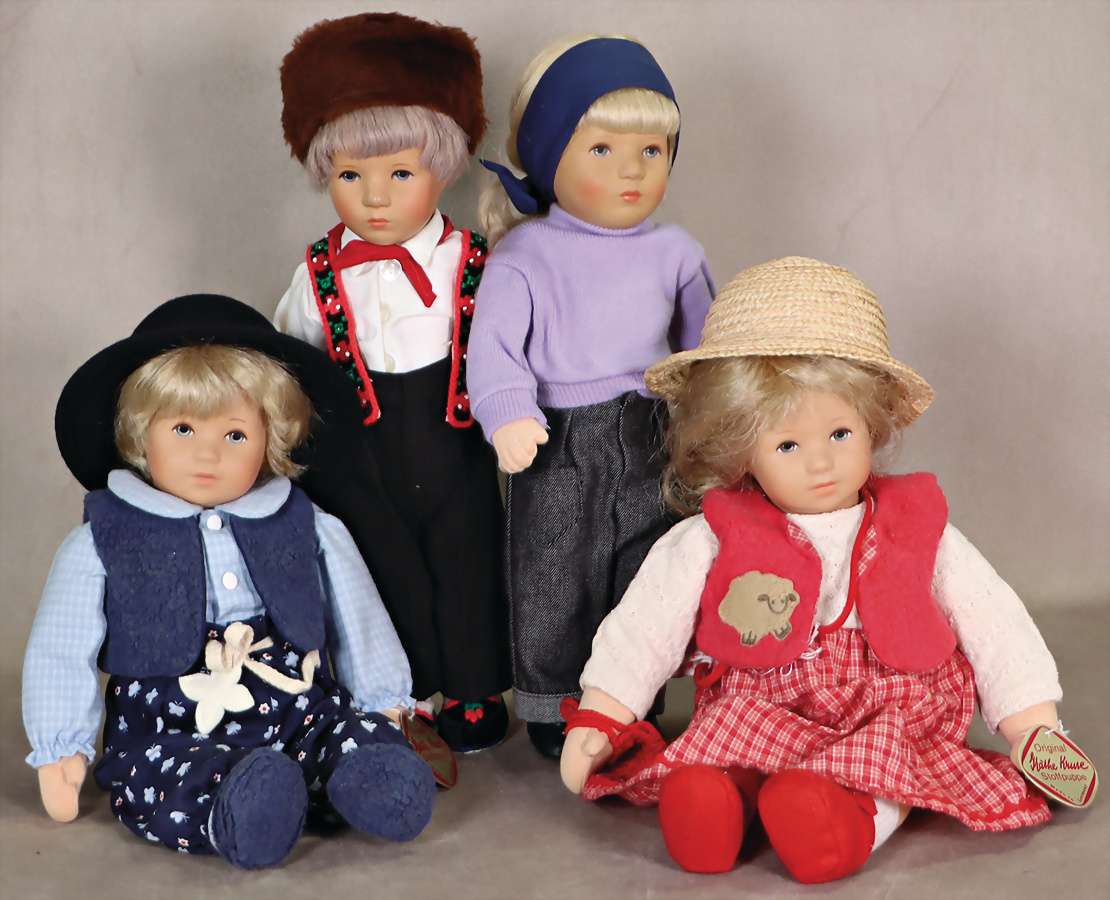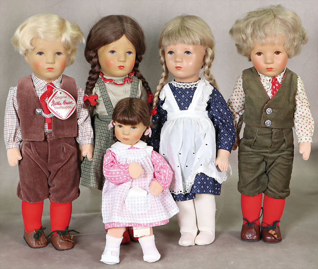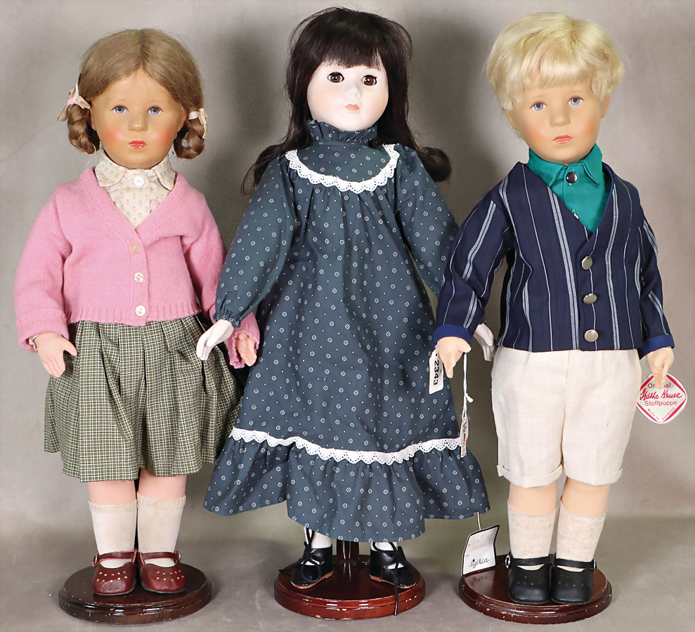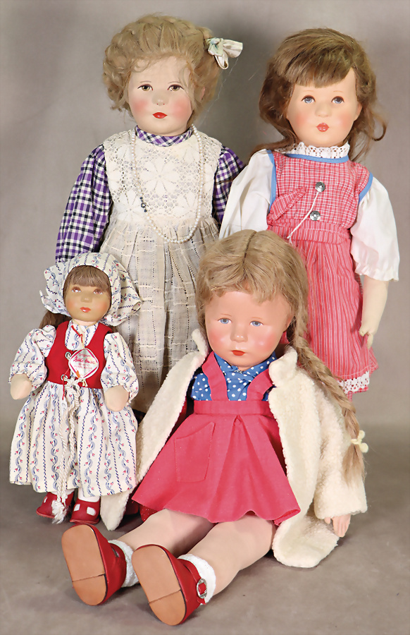 Nachkrieg, Mädchen, 50 cm, Kunststoffkopf, Farbunterschied an der Halskrause, optisch sehr guter Zust., evtl., 1x bei KÄTHE KRUSE überarbeitet, KÄTHE KRUSE, Hampelchen, Kopf Tortulon, 47 cm, lose angenähte Arme u. Beine, KÄTHE KRUSE Mädchen, 50 cm, deutlicher Farbunterschied an der Halskrause, Kopf evtl. 1x bei KÄTHE KRUSE überarbeitet, 1 Däumelinchen, neuere Produktion