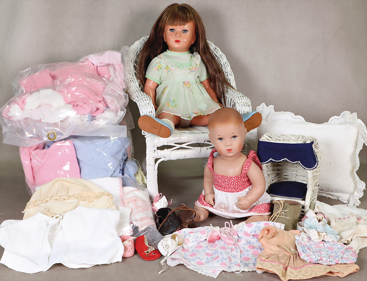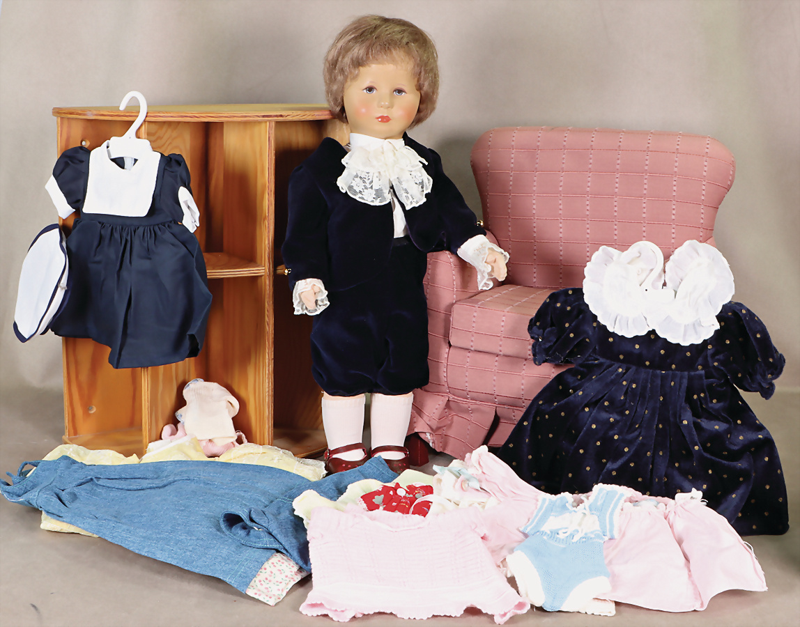 Gr. Konv. Puppenkleidung, Korbsessel, Dekostücke, 1 Puppe SCHILDKRÖT Typ KÄTHE KRUSE, Tortulon