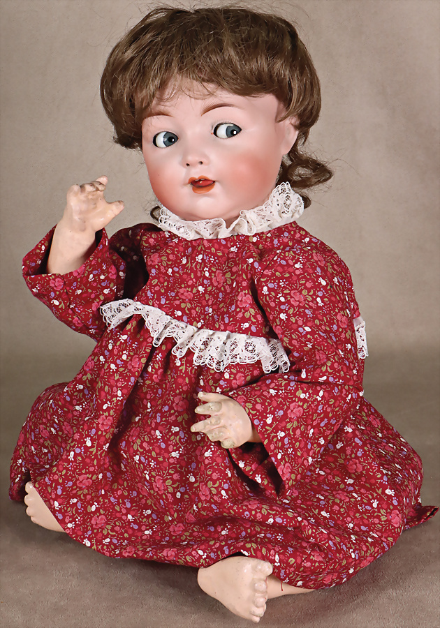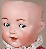 98/8, Porzellan-Charakter-Baby, 38 cm, Kurbelkopf, braune Schelmenaugen, off. Mund, Zähne u. Zunge, durchst. Nasenlöcher, Sitzbaby-Körper, 2 Finger fehlen, Kleidung u. Perücke neuer