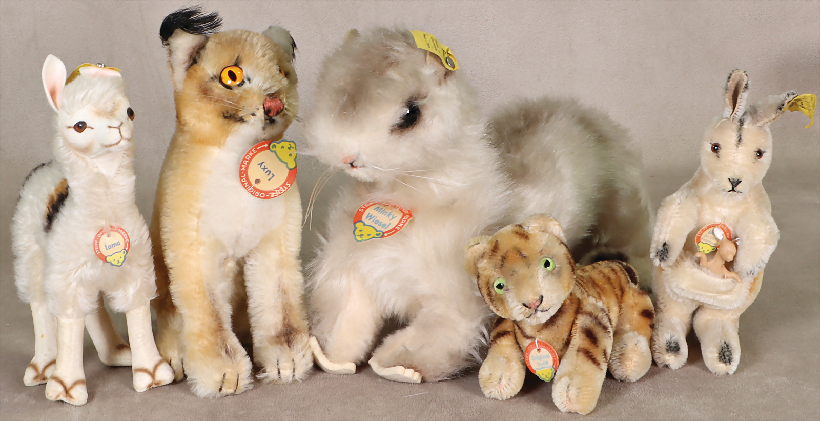 Konv., Lama, kompl., Nr. 1317.00, Linda, kompl., mit Kind, Nr. 0760/14, Minky Wiesel, kompl. Nr. 2230/22, Tiger mit Schild, Luchsi mit Schild, guter Zust.
